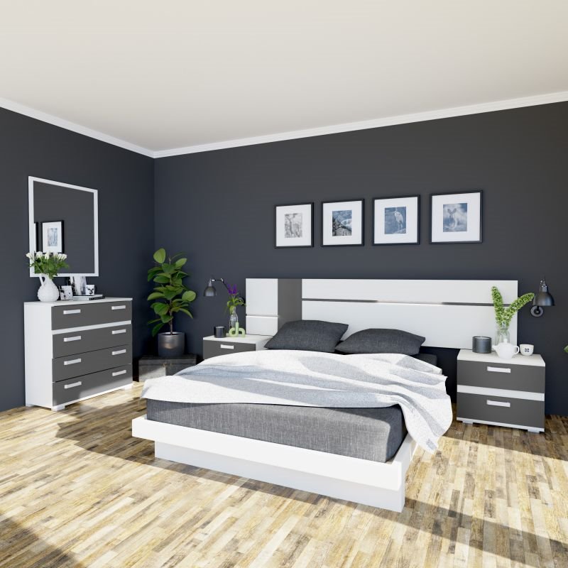 Por último, la cómoda ancha de esta composición de dormitorio cuenta con cuatro cajones en color blanco y grafito y tiradores en ABS color plateado, proporcionando un amplio espacio de almacenamiento para guardar ropa y objetos personales.