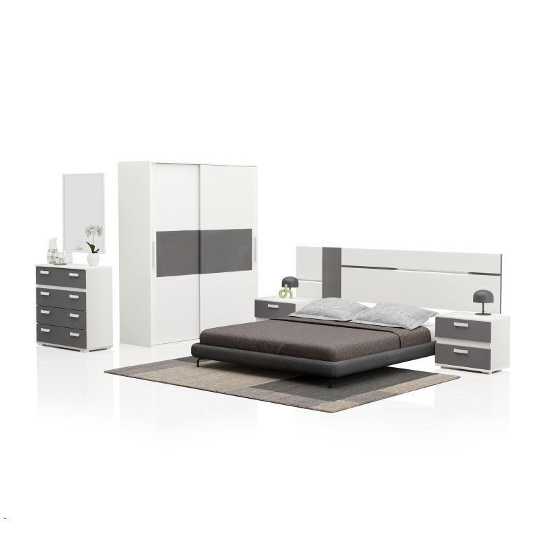 El cabecero con LEDs es el elemento central del dormitorio completo y está hecho en melamina de alta calidad con acabado en color blanco y grafito. Además, cuenta con una iluminación LED incorporada en la parte central que crea un ambiente cálido y acogedor en la habitación.