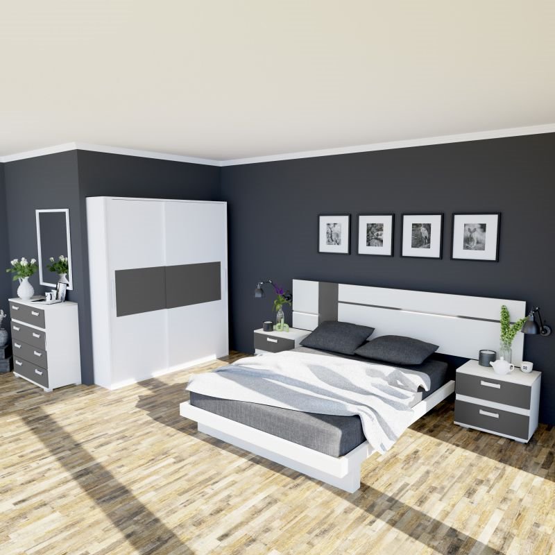 La cómoda ancha de esta composición de dormitorio cuenta con cuatro cajones en color blanco y grafito y tiradores en ABS color plateado, proporcionando un amplio espacio de almacenamiento para guardar ropa y objetos personales.