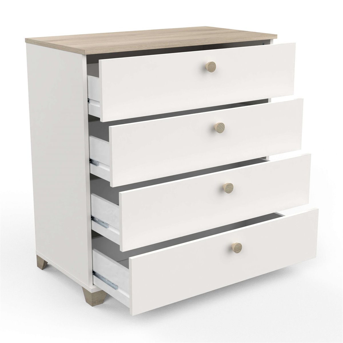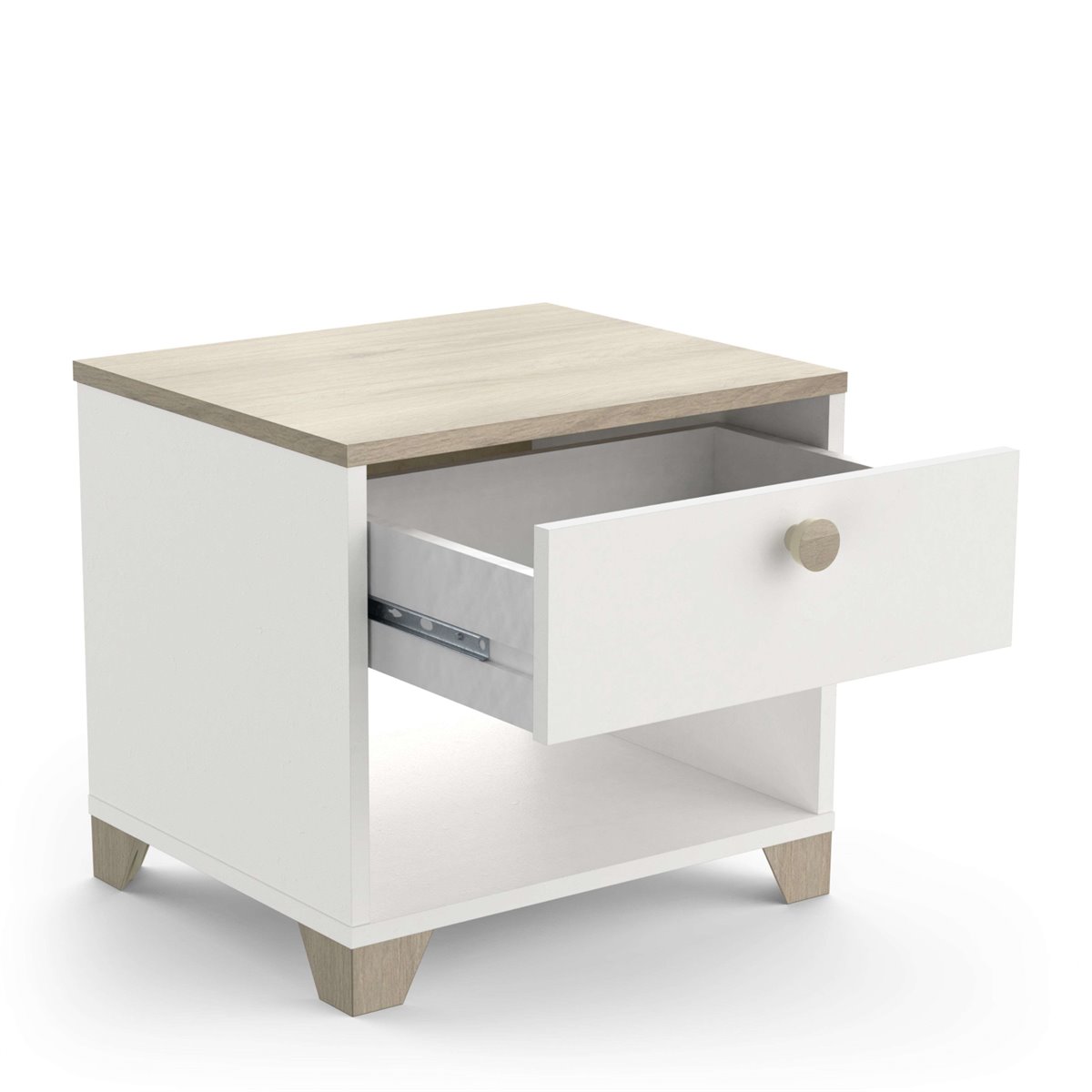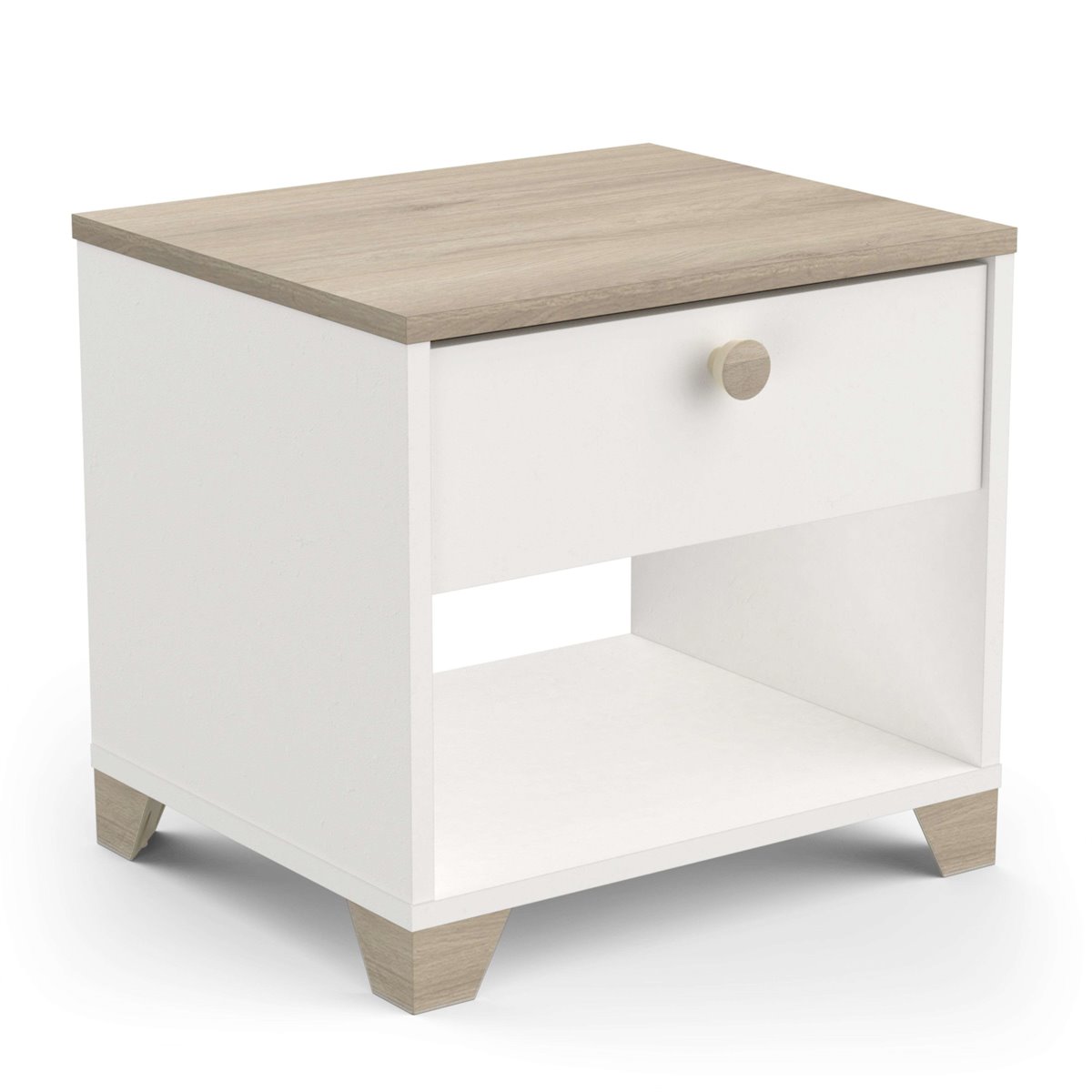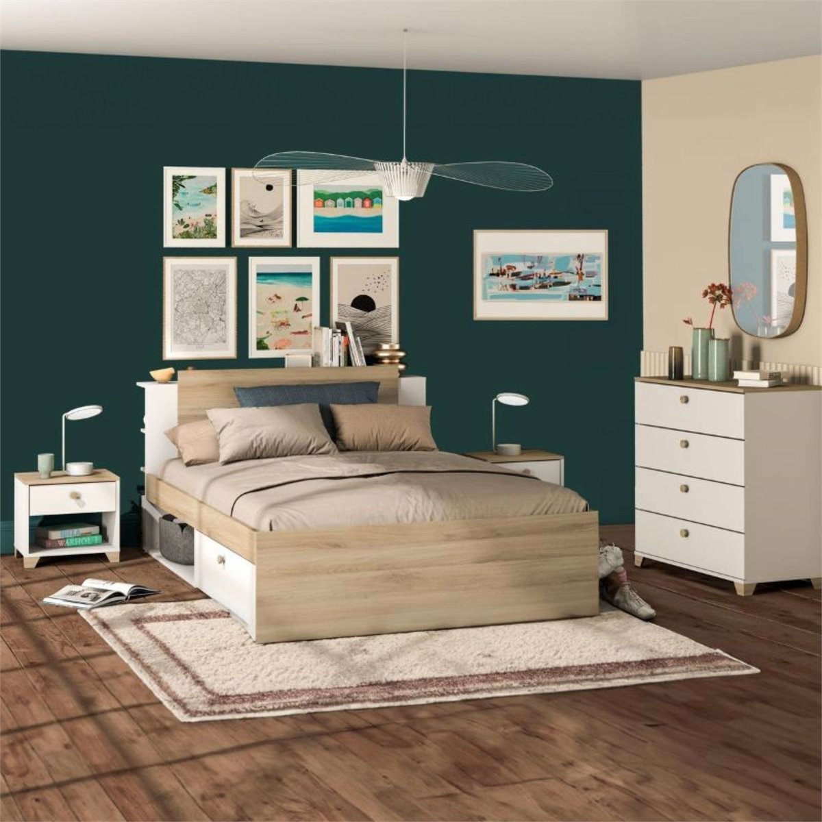 Añade un toque de estilo a tu hogar con nuestro dormitorio completo Izzy, Un conjunto de muebles para tu habitación, formado por una estructura de cama de 135 a 140 cm, Una cómoda de 4 cajones de almacenaje y dos mesitas con 1 cajón, Un diseño de gran personalidad, carácter y luz, El conjunto, fabricado en melamina resistente, combina el color blanco mate con el roble kronberg, Un modelo que lucirá como nada en tu hogar y hará que puedas presumir de muebles nuevos sin problema, Consigue una habitación modrna, con espacio y con el orden que necesitas, Medidas cama: Alto 87,7 cm Ancho 144,7 cm Profundidad 227 cm - Medidas mesitas: Alto 39'7 cm Ancho 43'2 cm Profundidad 36'2 cm - Medidas: Alto 85,1 cm Ancho 79,7 cm Profundo 41,9 cm Se trata de mobiliario con kit de montaje, que incluye manual de instrucciones y tornillería,Nota: Cama compatible con somieres de 135 o 140 de ancho, si utilizas la medida de 135 quedará un hueco al lado de la estructura de la cama, En el momento de montaje puedes adaptar la estructura a un largo de 190 cm o 200 cm, No incluye somier, colchón ni elementos decorativos de las imágenes