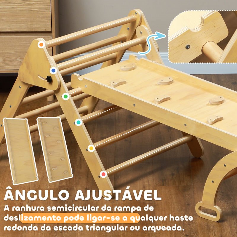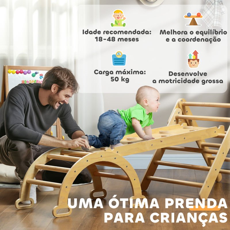 Este versátil conjunto de psicomotricidad 5-en-1 incluye un triángulo de escalada, un arco escalador que también se puede usar como balancín y una tabla que, por un lado, es lisa y se puede usar como tobogán y por la otra es tiene peldaños para que los niños puedan trepar. Todo diseñado pensando en la seguridad y el desarrollo de tu pequeño, fomentando habilidades como el equilibrio y la autonomía a la vez que se divierten.