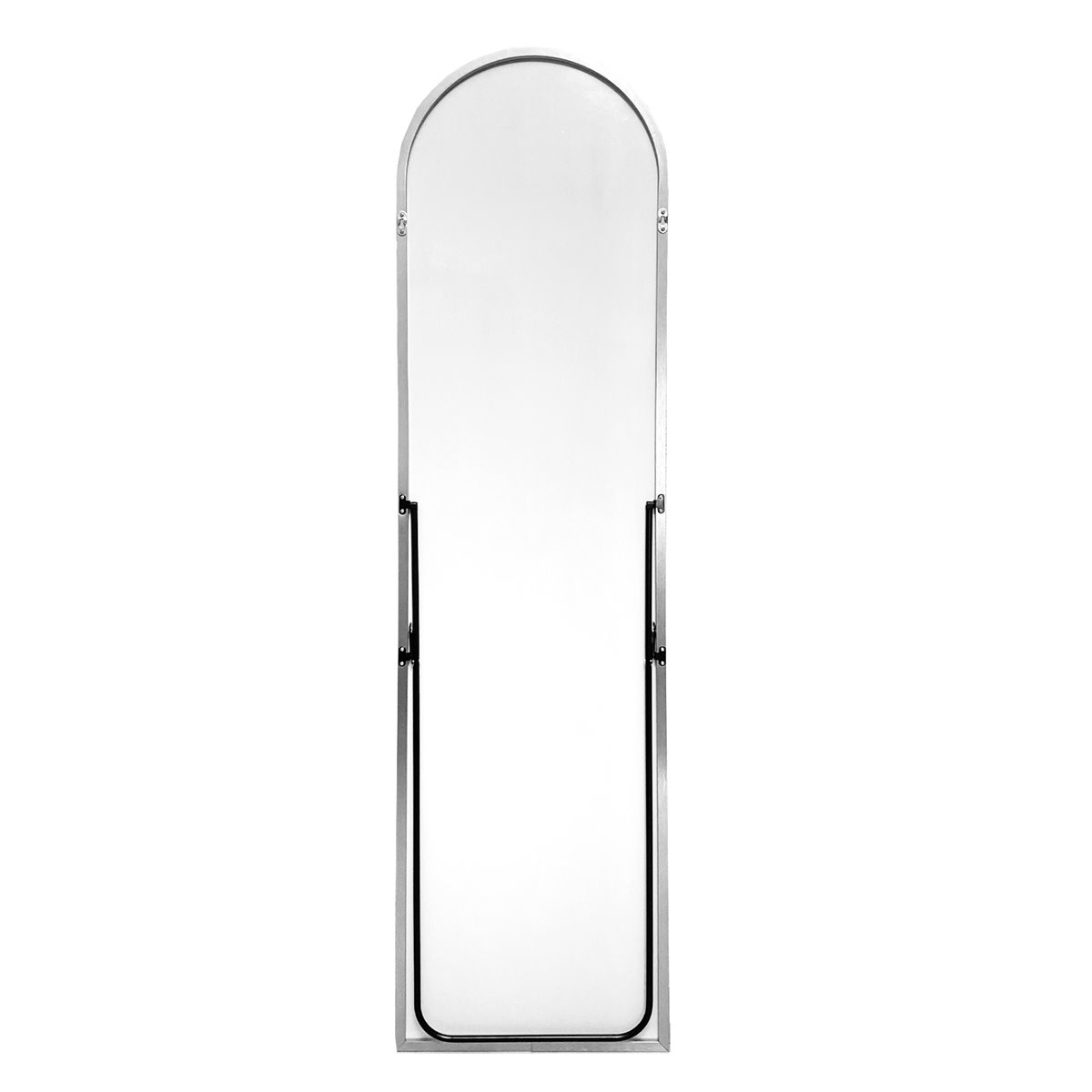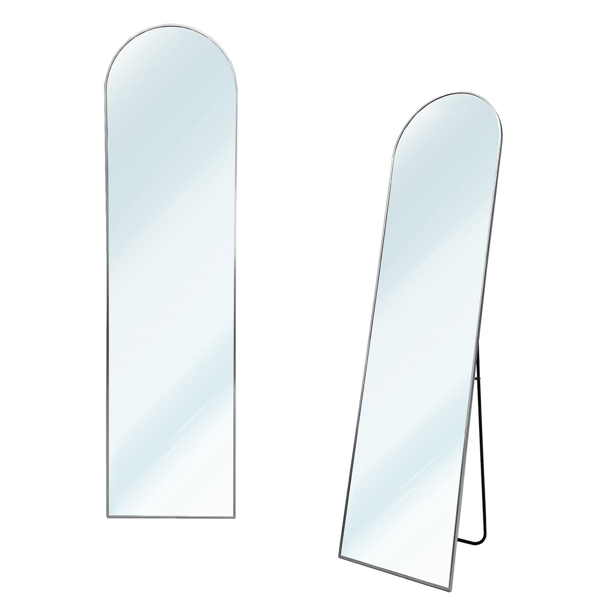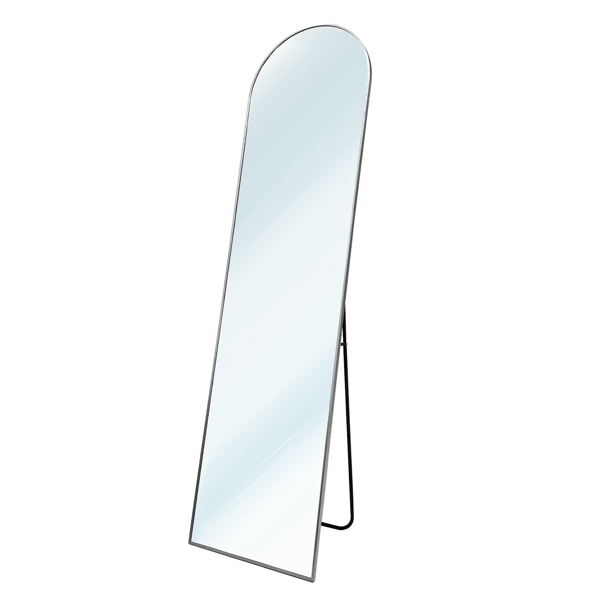 Espejo de pie metálico de cuerpo entero con acabado gris metálico.