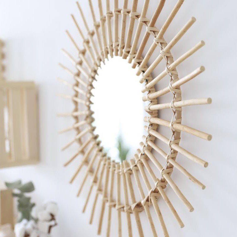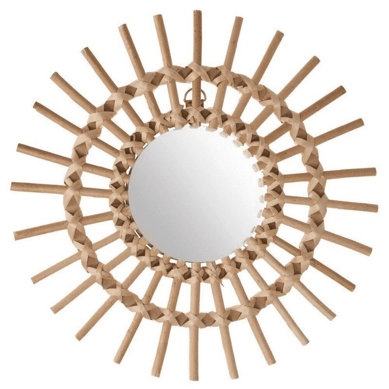 Bonito espejo realizado en rattan con forma de sol. Es un espejo esta disponible en dos tamaños y son muy decorativo. Es un accesorio muy versátil ya que lo puedes utilizar para decorar una habitación de adulto pero también una habitación infantil.