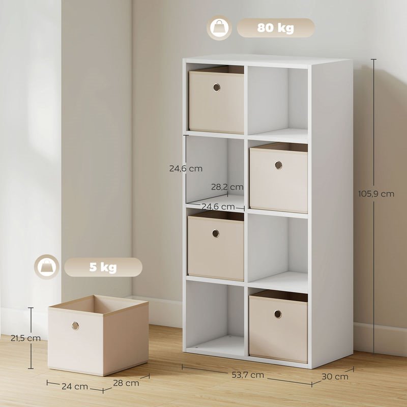 - Cuenta con 8 cubos espaciosos y 4 cajones de tela, ideales para mantener tus cosas bien organizadas