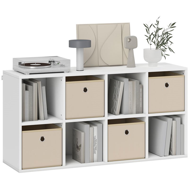 Organiza fácilmente cualquier espacio con esta estantería modular de HOMCOM. Con 8 cubos y 4 cajones de tela, te permite mantener en orden libros, juguetes, ropa o decoración. Su diseño funcional en melamina de madera resistente a los arañazos es ideal para cualquier hogar. Gracias a su estructura flexible, puedes colocarla en horizontal o vertical según tu espacio. Es fácil de limpiar y se adapta a diferentes estilos y ambientes.