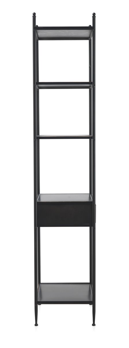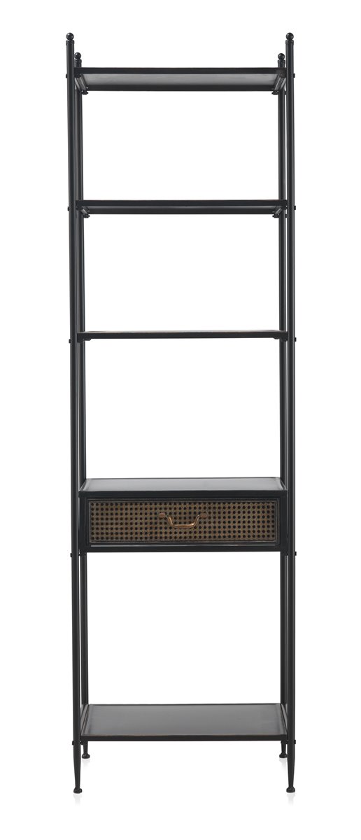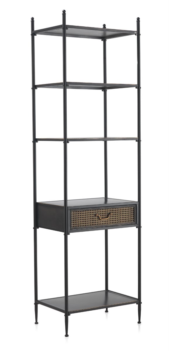 Los muebles de metal están de moda. En Geesehome hemos desarrollado esta librería con cinco estantes y un cajón en el centro. El frontal del cajón es de malla metálica dorada, lo que le da al mueble un toque diferente y elegante. Gracias a su tamaño, cabe en cualquier sitio.