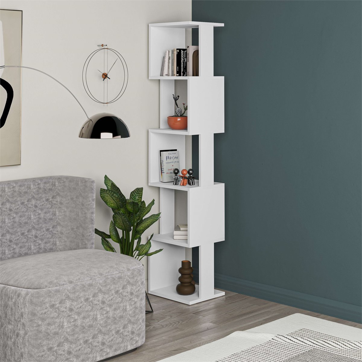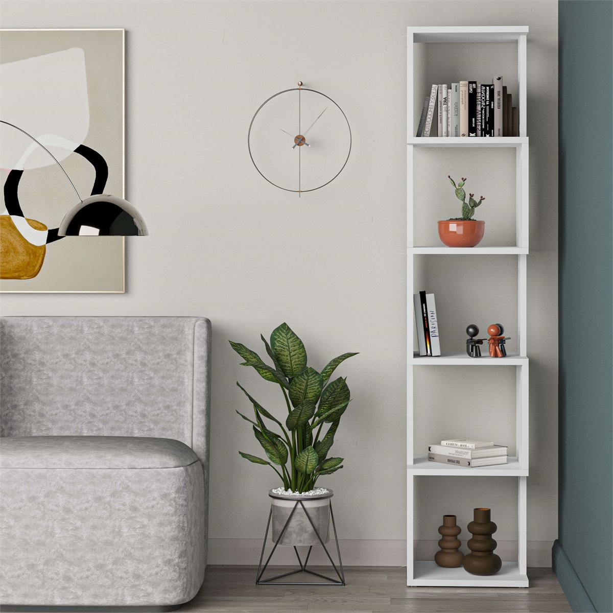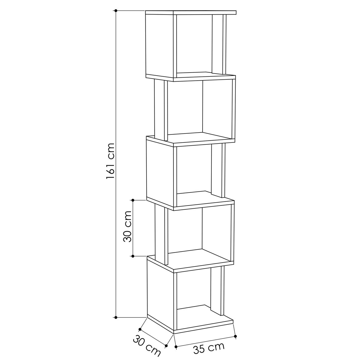 Suma a tus muebles de salón la estantería Guan color blanco, Aporta modernidad, estilo y personalidad a tu estancia, y combina la decoración de tu comedor sin esfuerzo, Empieza a crear un hogar con carácter y disfruta de tu día a día con los mejores muebles de comedor, Este mueble está fabricado en melamina resistente, Cuenta con un diseño fresco y actual con cinco huecos colocados en vertical, Tiene un acabado en blanco mate, por lo que podrá combinarse con facilidad con el resto de muebles de tu salón, Gracias a sus dimensiones, podrás situarlo en algún rincón vacío de la estancia, Conseguirás darle un aire más actual con esta pieza, Corre y crea tu lugar favorito, Medidas: Ancho 35 cm Alto 161 cm Profundo 30 cm Se trata de mobiliario con kit de montaje, que incluye manual de instrucciones y tornillería,