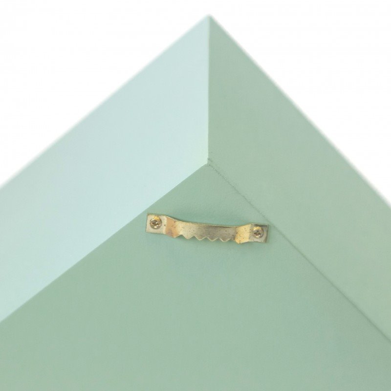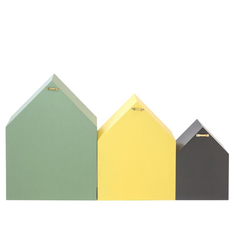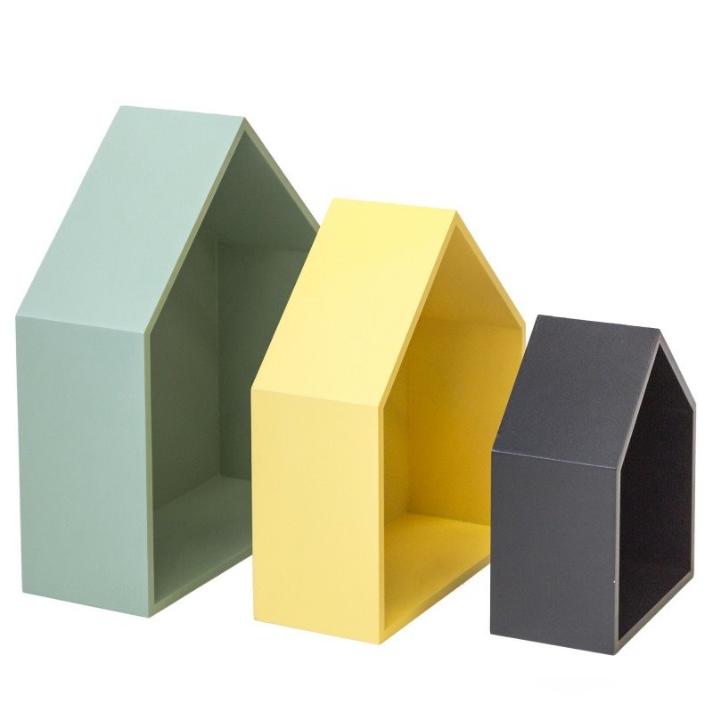 Set de estantes infantiles de tres colores distintos con forma de casita . Cada estante tiene unas medidas diferentes.