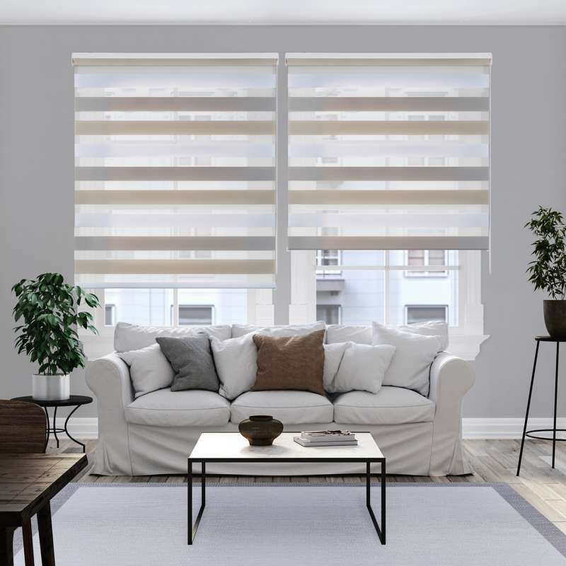 Estor enrollable noche y día decorativo y muy funcional, ideal para cualquier estancia: cocinas, salones, comedores, dormitorios, despachos... Disponible en altura de 180cm (ventanas) y 250cm (puertas).Persiana enrollable con tejido de doble caída y doble posición: juega con la luminosidad y privacidad de la estancia. Cuando el estor está cerrado, tendrás alta privacidad. Cuando está abierto, la privacidad será moderada. Composición: 100% Poliéster.Cómodo accionamiento mediante cadeneta. El mecanismo es de aluminio y lleva una tapa decorativa, el contrapeso queda oculto.Incluye soportes metálicos, accesorios para instalación a techo o pared y sistema de seguridad infantil. Fácil limpieza con un paño ligeramente húmedo.
