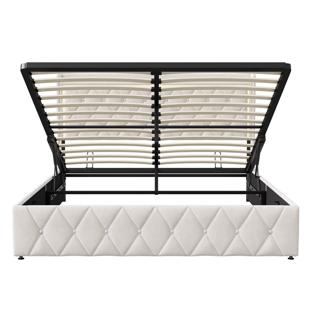 Esta cama con canapé de terciopelo beige está disponible en tamaños de 140 x 200 cm o 160 x 200 cm, diseñada para quienes buscan elegancia y funcionalidad. Con espacio de almacenamiento integrado bajo el somier, esta cama con plataforma es ideal para optimizar el espacio.