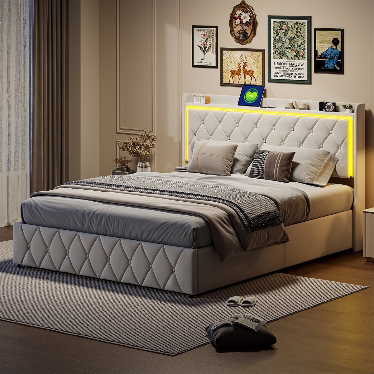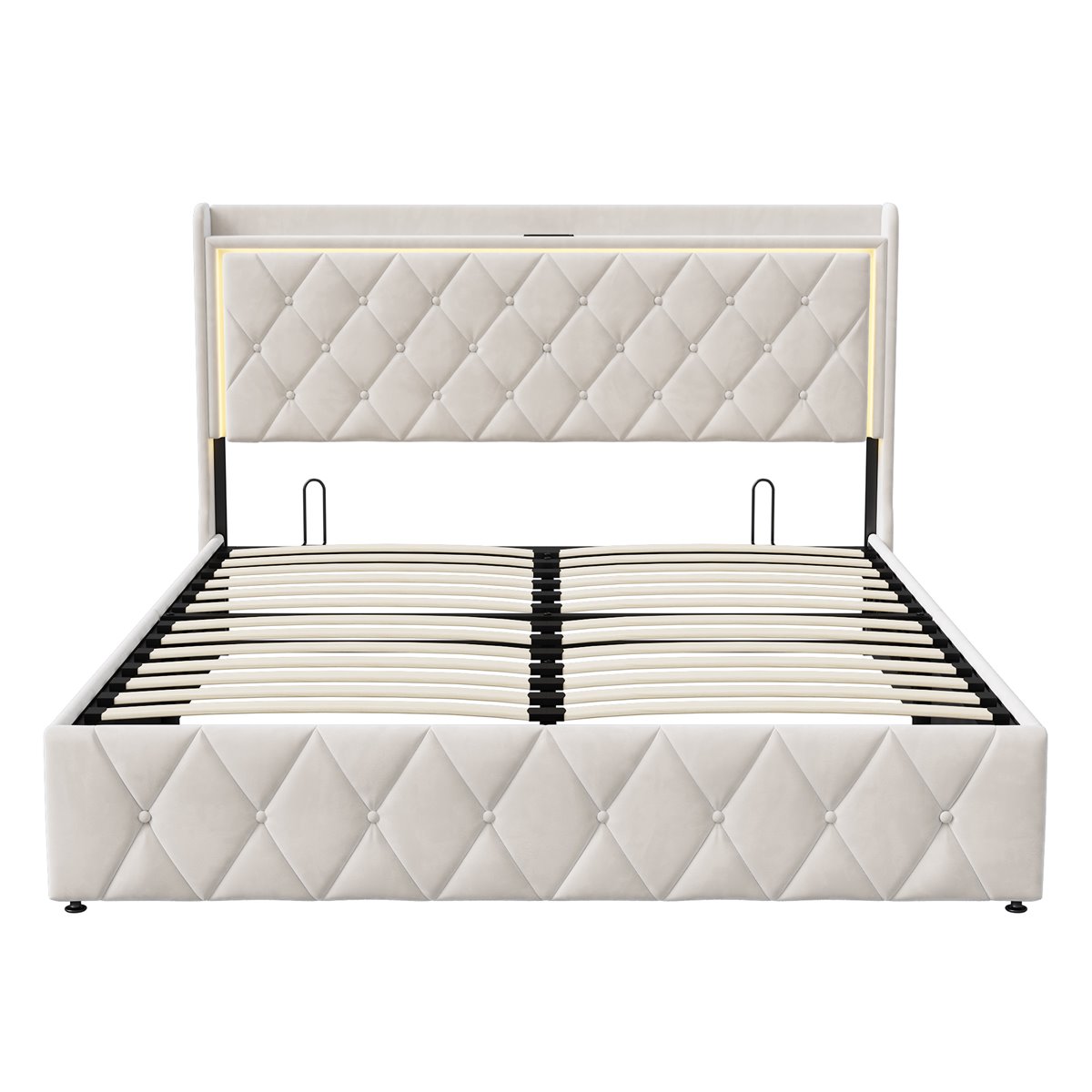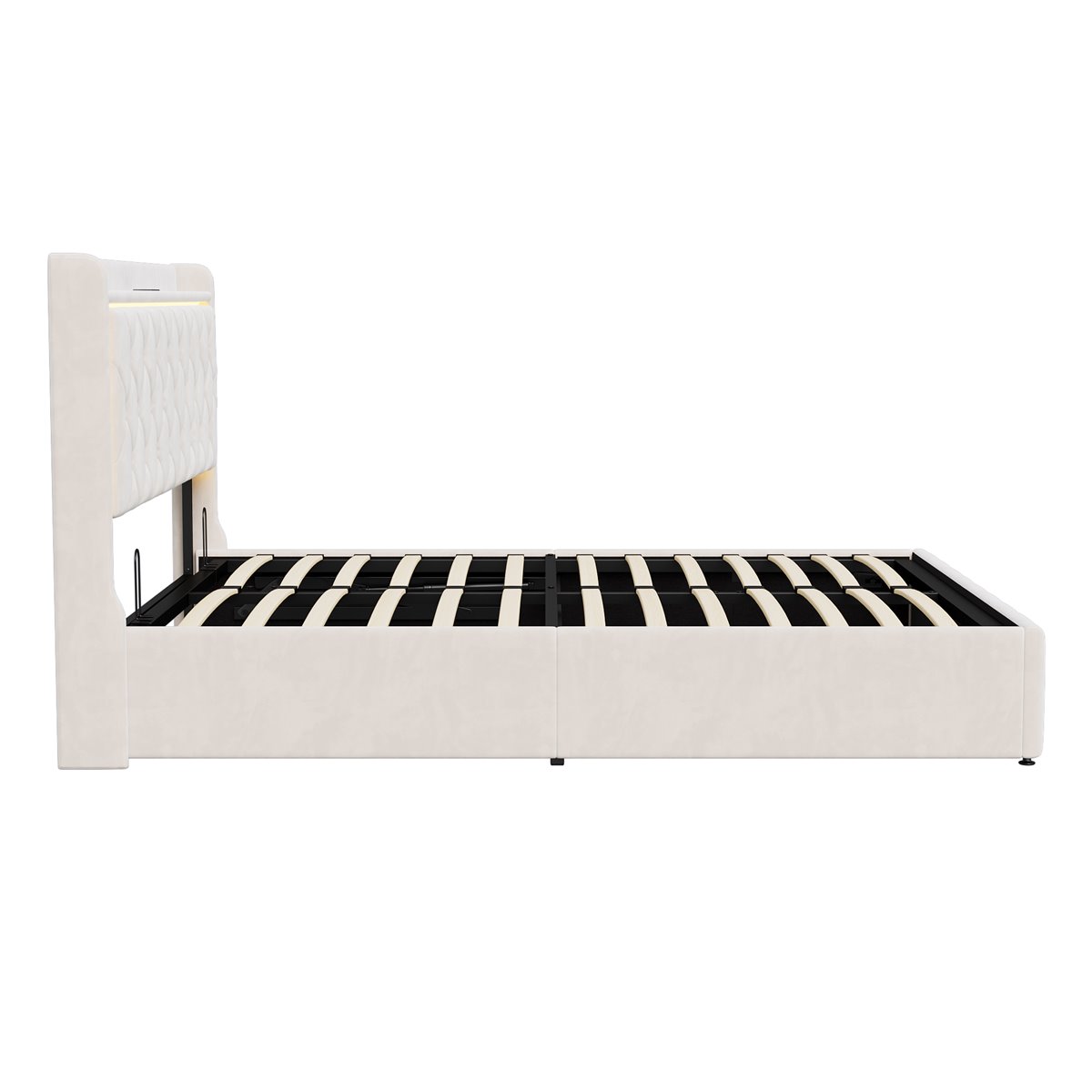 Esta cama para adultos con somier de láminas cuenta con un amplio espacio de almacenamiento bajo el somier, perfecto para optimizar el espacio del dormitorio. Cabecero con luces LED y estación de carga: