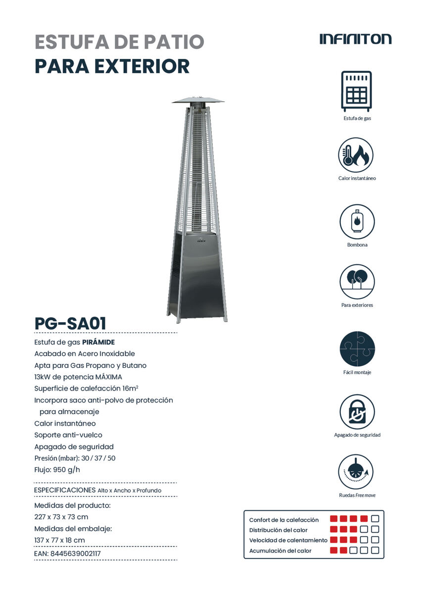 | Estufa de gas PIRÁMIDE. Apta para Gas Propano o Butano. Rejilla de seguridad. Incorpora saco anti-polvo de protección. para almacenaje. Calor instantáneo. Soporte anti-vuelco. Apagado de seguridad. Presión (mbar): 30 / 37 / 50. Flujo: 950 g/h. Calor instantáneo. Apagado de seguridad. Bombona. Incorpora saco anti-polvo de protección para almacenaje. Ruedas. Superficie de calefacción: 16m2. 13kW de potencia máxima. Medidas del producto: 227 x 73 x 73 cm. Medidas del embalaje: 137 x 77 x 18 cm. (Alto x Ancho x Profundo). |
