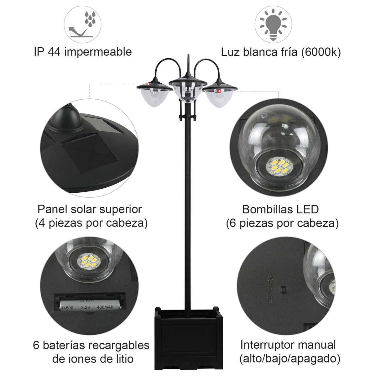 - Farola de exterior con 3 puntos de luz con paneles solares