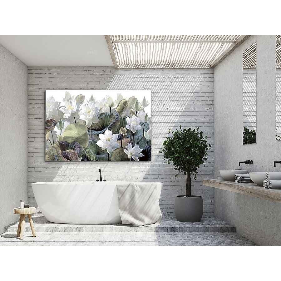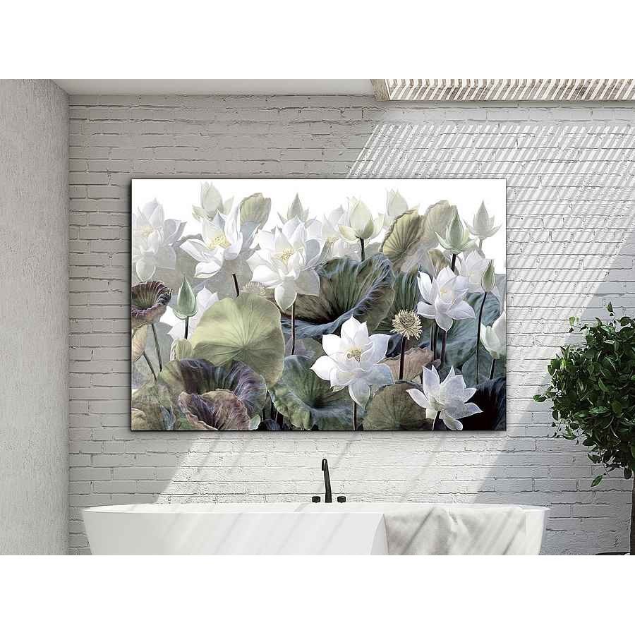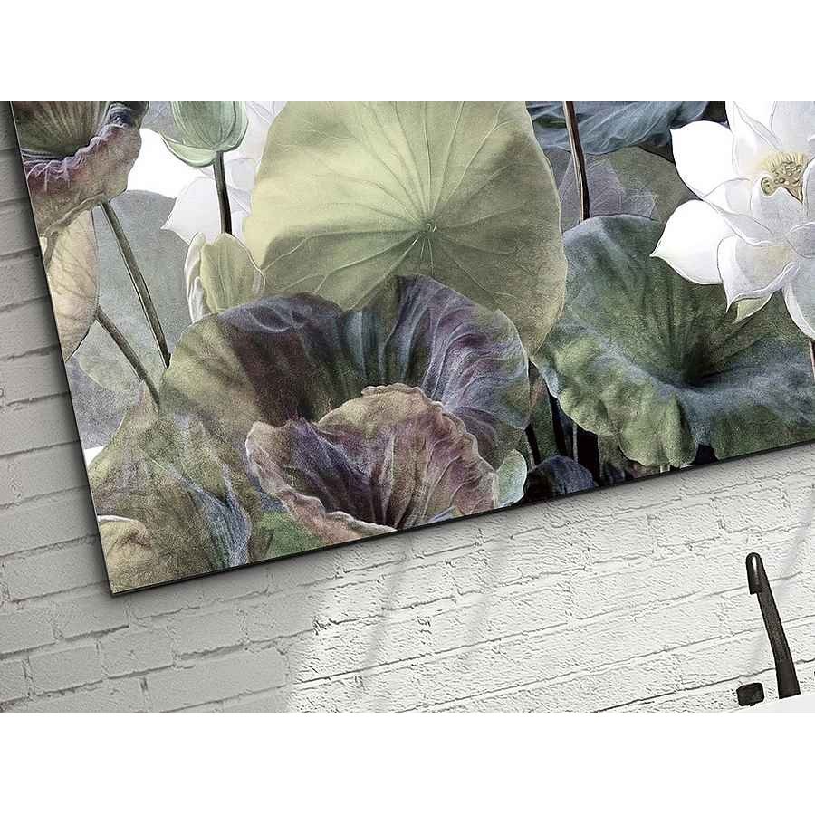 Esta fotografia impresa es ideal para dar un toque moderno, realzada en la naturaleza con flores blancas y hojas verdes, con toques en morado en algunas hojas, esta realizada y montada en cristal templado. Incluye herraje para sujección a pared. tiene de alto 100 cm, con un ancho de 150 cm y su fondo es de 4 cm. Con un peso de 15 kg.