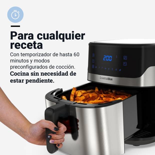 La freidora de aire 6,5 litros AIR-CRISPY 6006B de UniversalBlue es perfecta para quienes buscan cocinar de forma sana, cómoda y sin aceite. Con una gran capacidad y múltiples funciones automáticas, esta freidora sin aceite es ideal para familias numerosas.