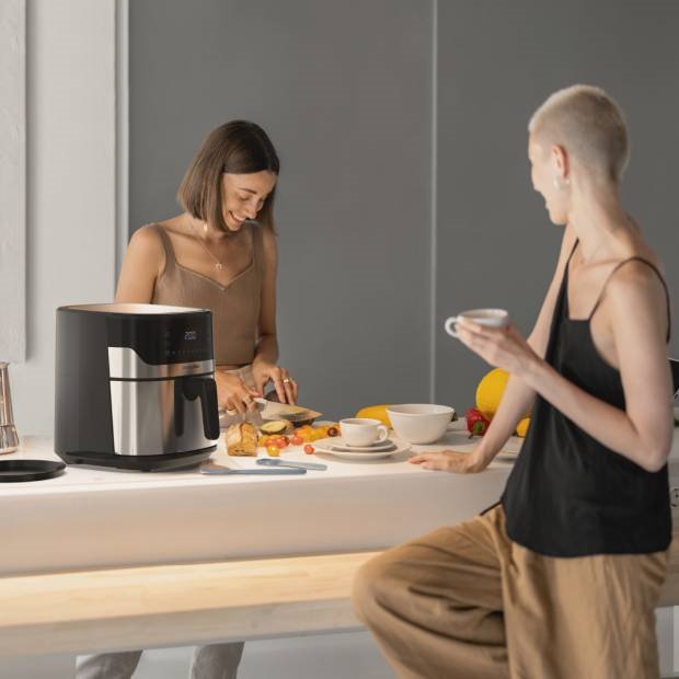 Gracias a su sistema de circulación de aire caliente, esta freidora permite obtener resultados crujientes por fuera y tiernos por dentro, sin necesidad de usar aceite. Cocina sin olores, sin grasa y sin complicaciones.