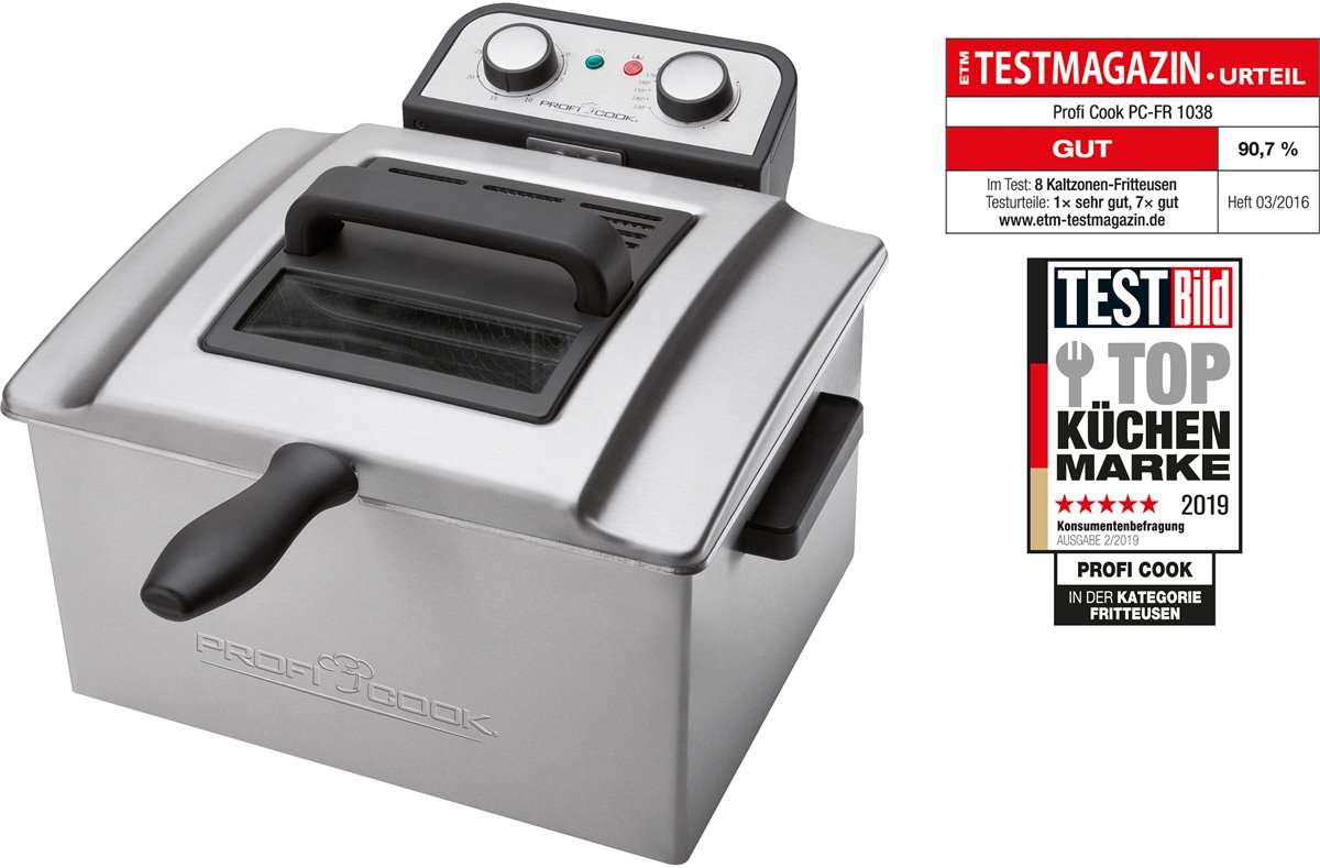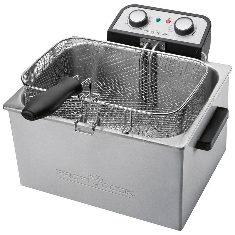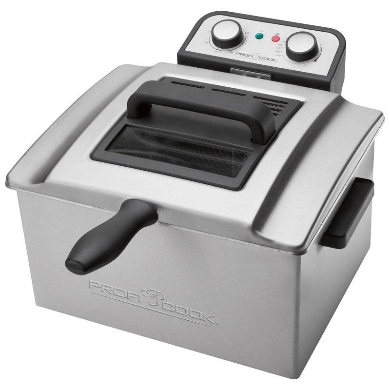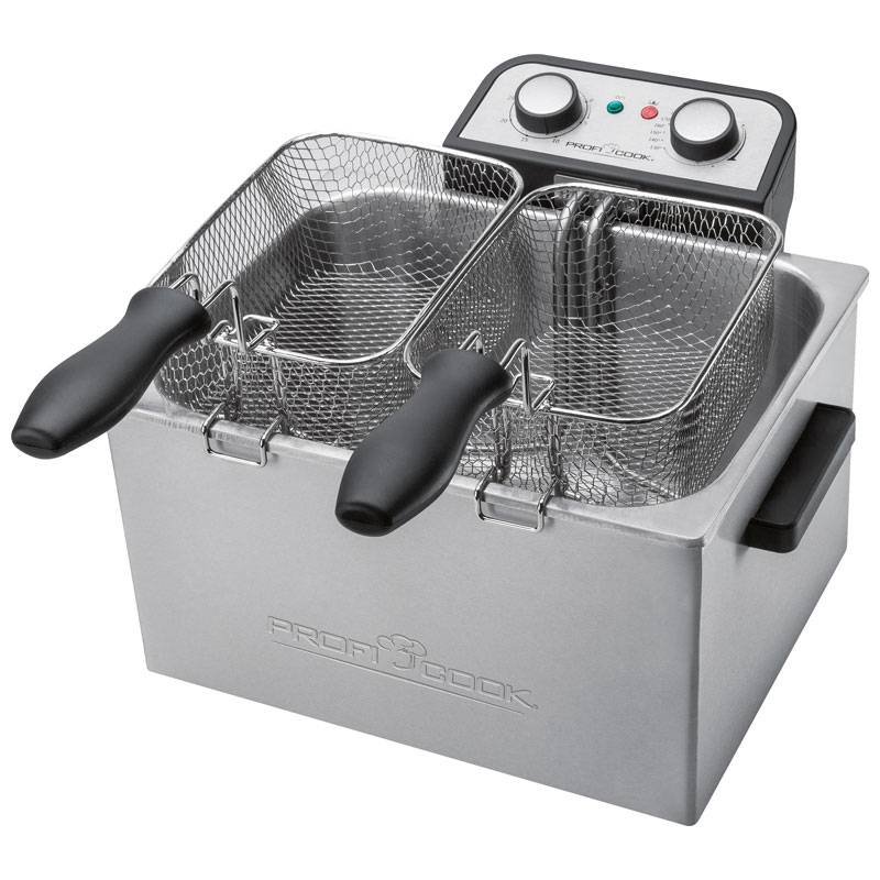 La freidora Proficook FR 1038 es una práctica freidora profesional con resistencias inmersas directamente en el aceite permitiendo un calentamiento más rápido y una menor emisión de olores. Tiene una potencia de 3000 W y una capacidad de 5 litros de aceite que la hacen ideal tanto para el uso privado como para pequeños negocios. Viene equipada con 3 diferentes cestos para poder freír varios alimentos al mismo tiempo y darle a cada alimento su tiempo de cocinado deseado.