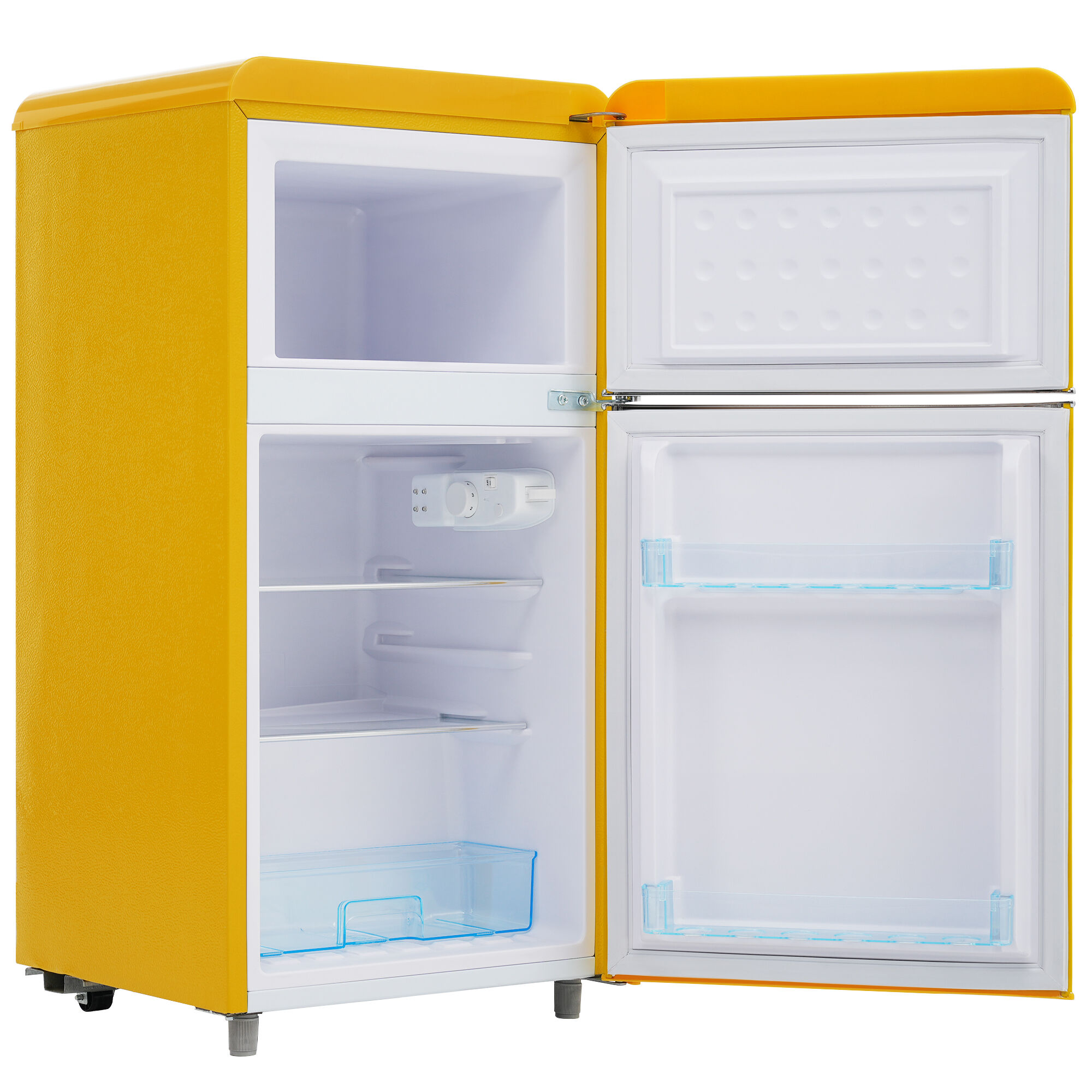- Frigorífico retro de doble puerta (congelador superior + frigorífico inferior), ideal para cocinas pequeñas, oficinas o segundas residencias