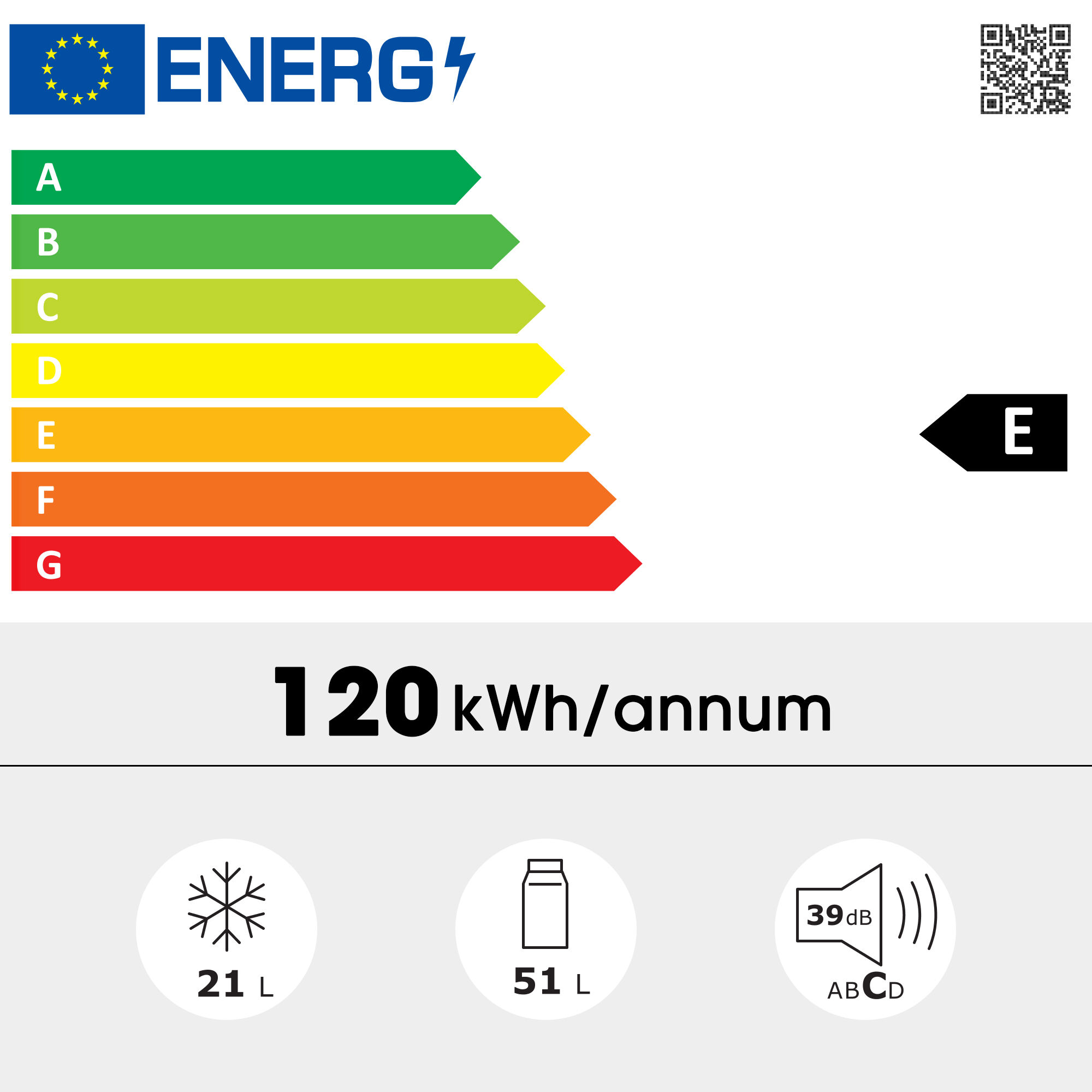 - Eficiencia energética clase E, bajo consumo de 120 kWh/año y nivel de ruido de 39dB.
