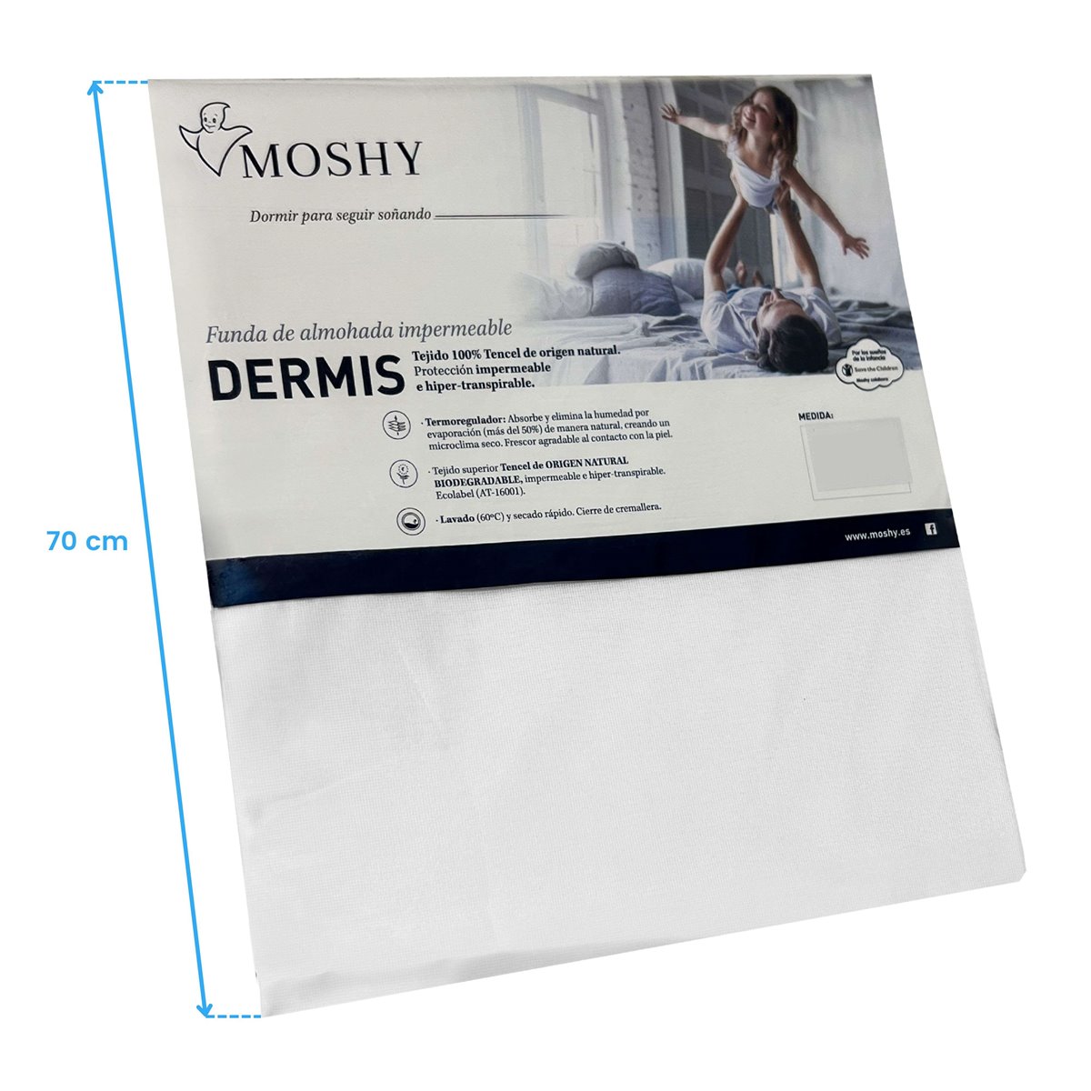 Increíble funda Dermis para almohadas fabricada con una membrana de poliuretano impermeable y transpirable, con la que podrás proteger tu almohada de la humedad y de otros factores externos que puedan dañarla. Esto la convierte en la opción perfecta si buscas una funda resistente a la humedad ¡no te quedes sin la funda Dermis! Práctica funda para almohadas fabricada en punto 100% Tencel, lo cual refuerza su resistencia a fluidos y su transpirabilidad. Funda con cierre de cremallera para que puedas incorporar fácilmente la almohada y evites su salida. Funda para almohadas individuales de 70 cm.