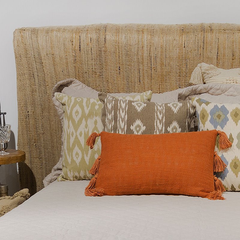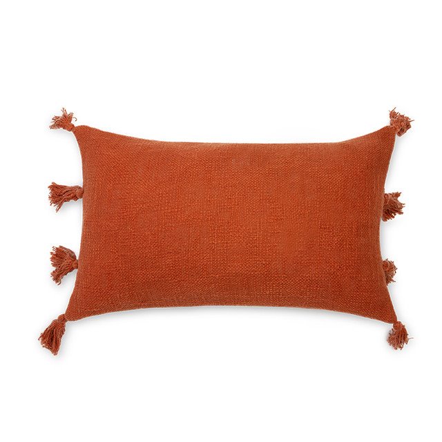Funda de cojín de tejido extra suave 100% algodón. Diseño en liso pero con pompones en todos los lados, lo hacen una prenda cómoda, funcional y muy decorativa. Medida 30x50, color teja.