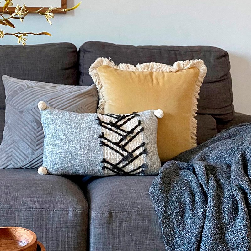 Funda de cojín de algodón con aplicaciones en negro. Pompones en los 4 extremos. Diseño suave en tonos grisaceos. Perfecto para decorar con look industrial.