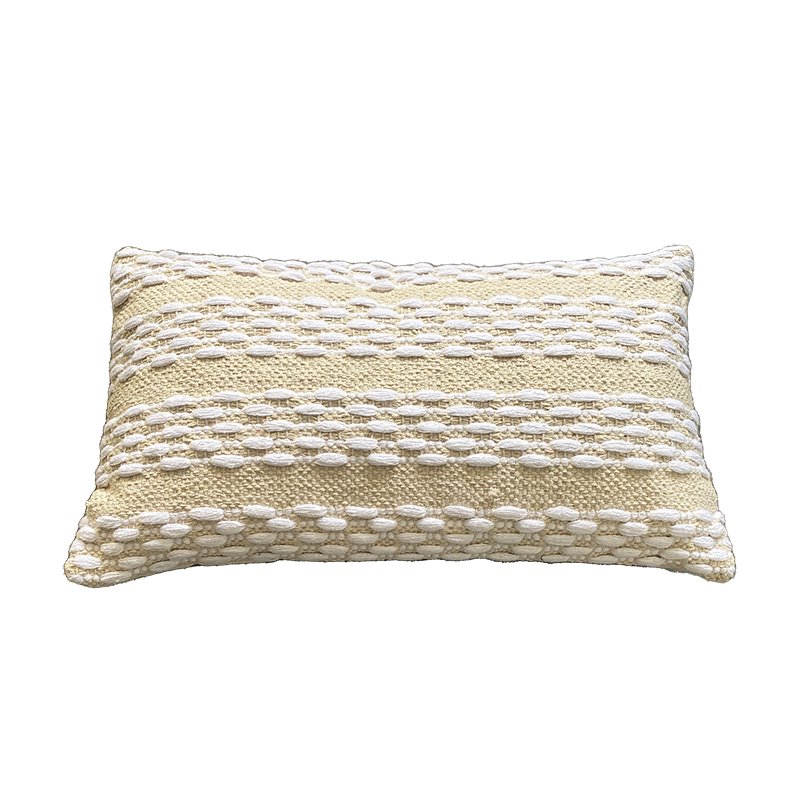 Funda de cojín neutra en fondo crudo con aplicaiones en blanco. Cojín muy neutro perfecto para combinar con todo tipo de decoración. Forma parte de nuestra Naturals Capsule.