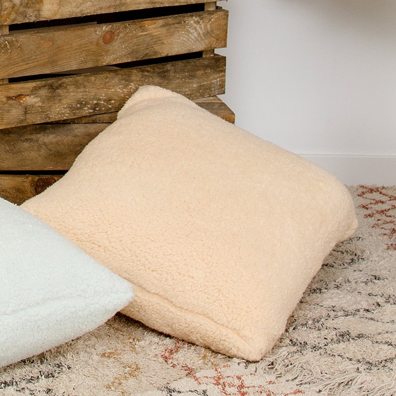 Funda de cojín hecho a partir de fibra de poliéster o lo que es lo mismo, cojín confeccionado a partir de manta de borreguillo con tacto extra esponjoso y suave. Disponible en 4 colores.