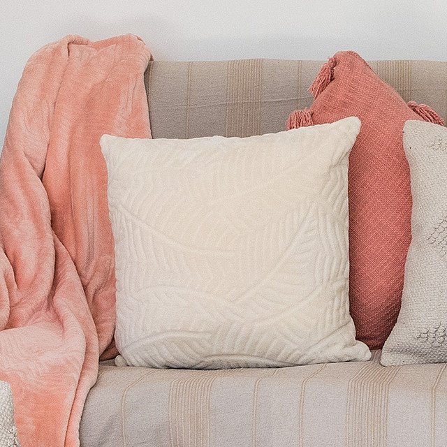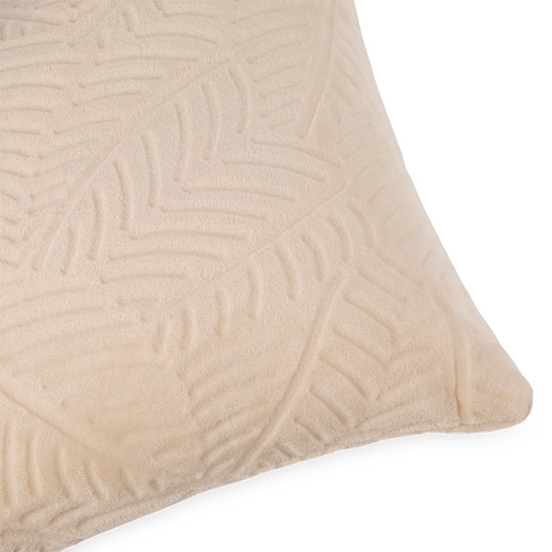 Funda de cojín hecho a partir de fibra de poliéster o lo que es lo mismo, cojín hecho de manta de sedalina tacto extra suave. Sutil dibujo de hojas, hecho con la técnica de raspado o relieve. Disponible en 3 colores.