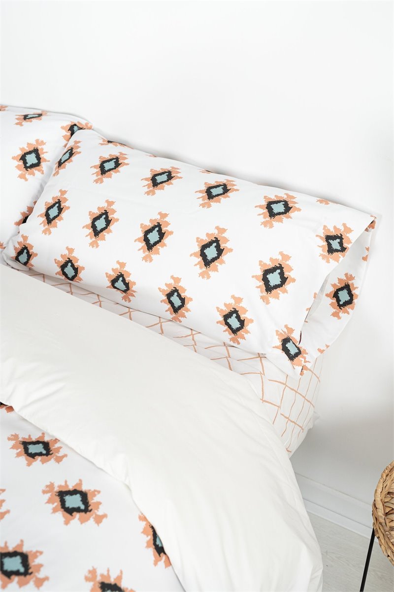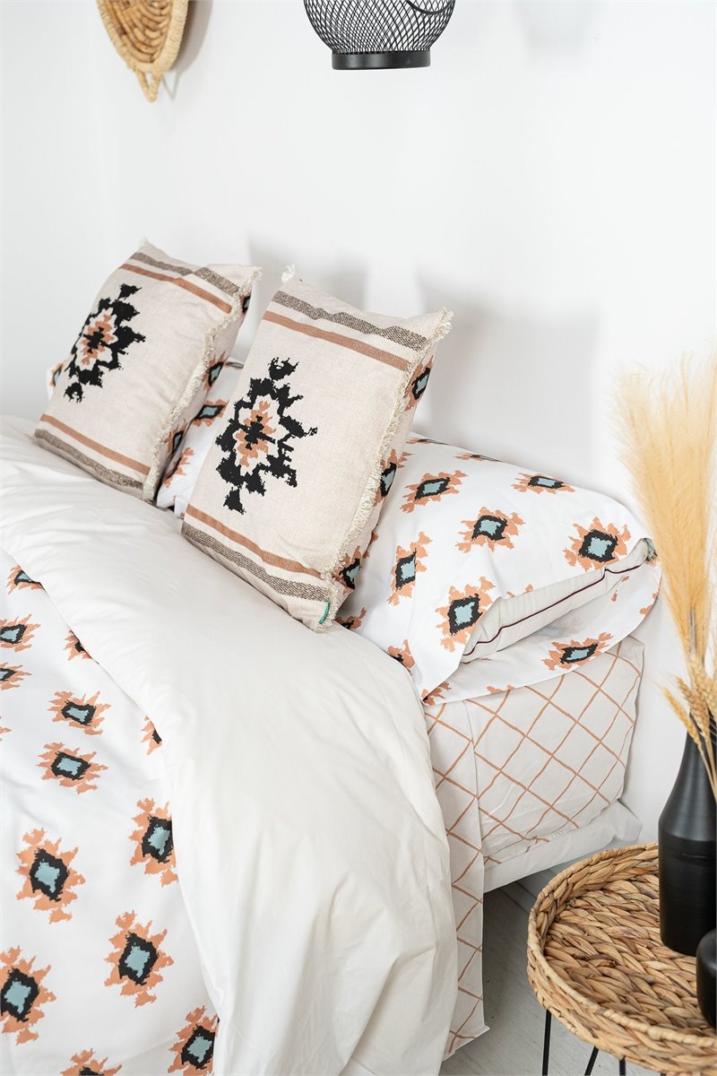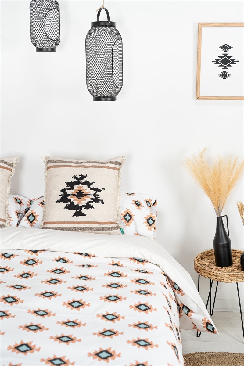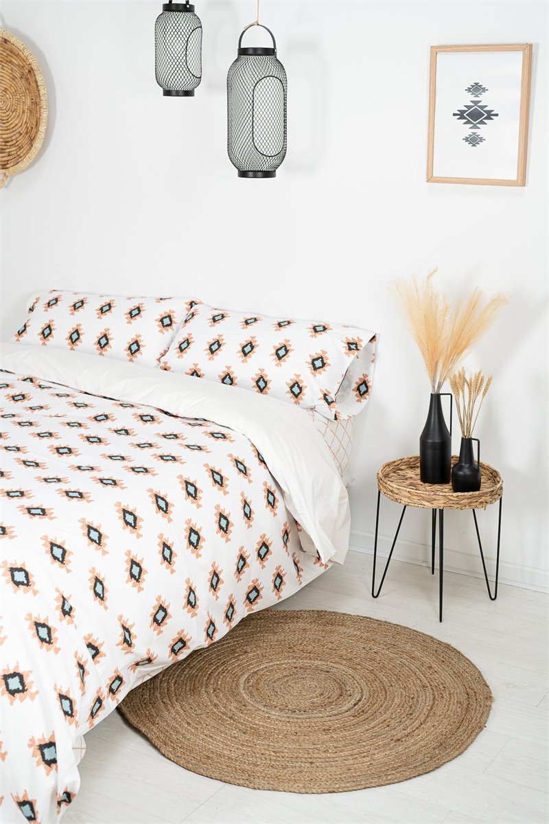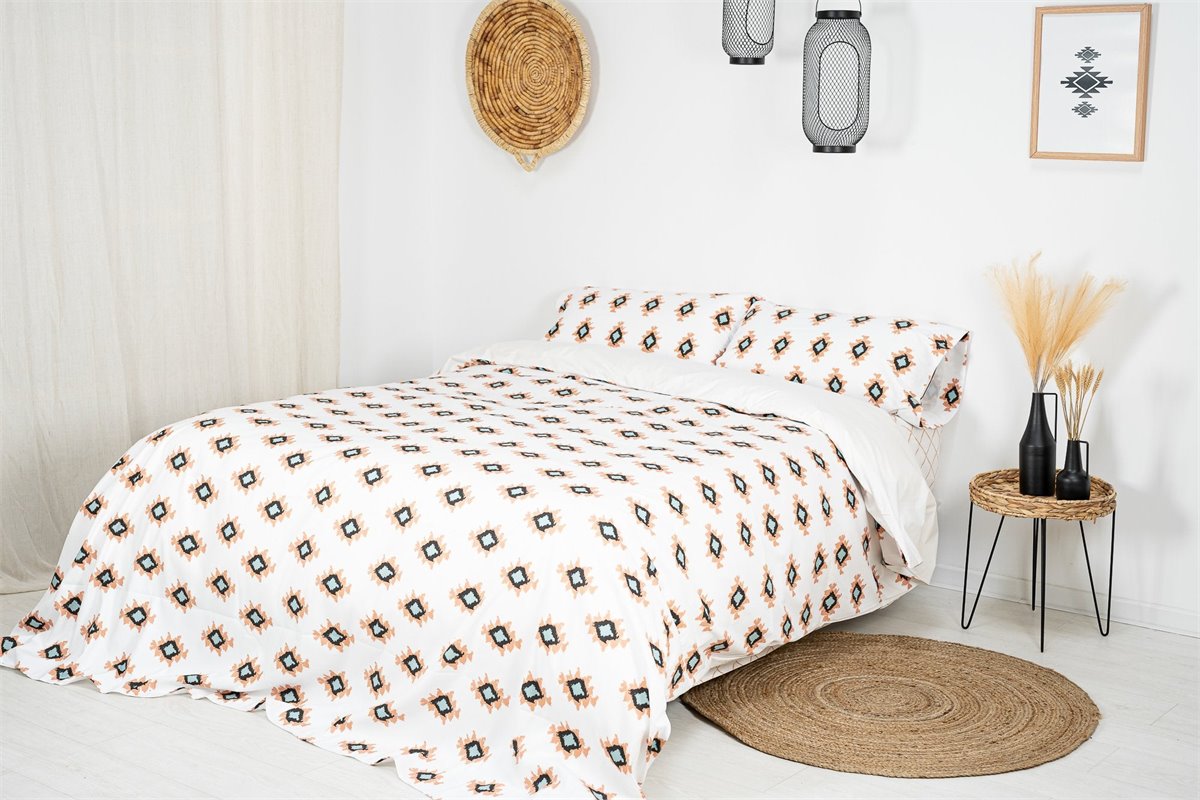 Funda nórdica con estampado digital que no destiñe ni pierde color. La funda es más larga de lo normal y totalmente abierta en el inferior para que la puedas meter bajo el colchón y no se mueva durante la noche, o la dejes caer para que tape las patas de la cama a modo de colcha.