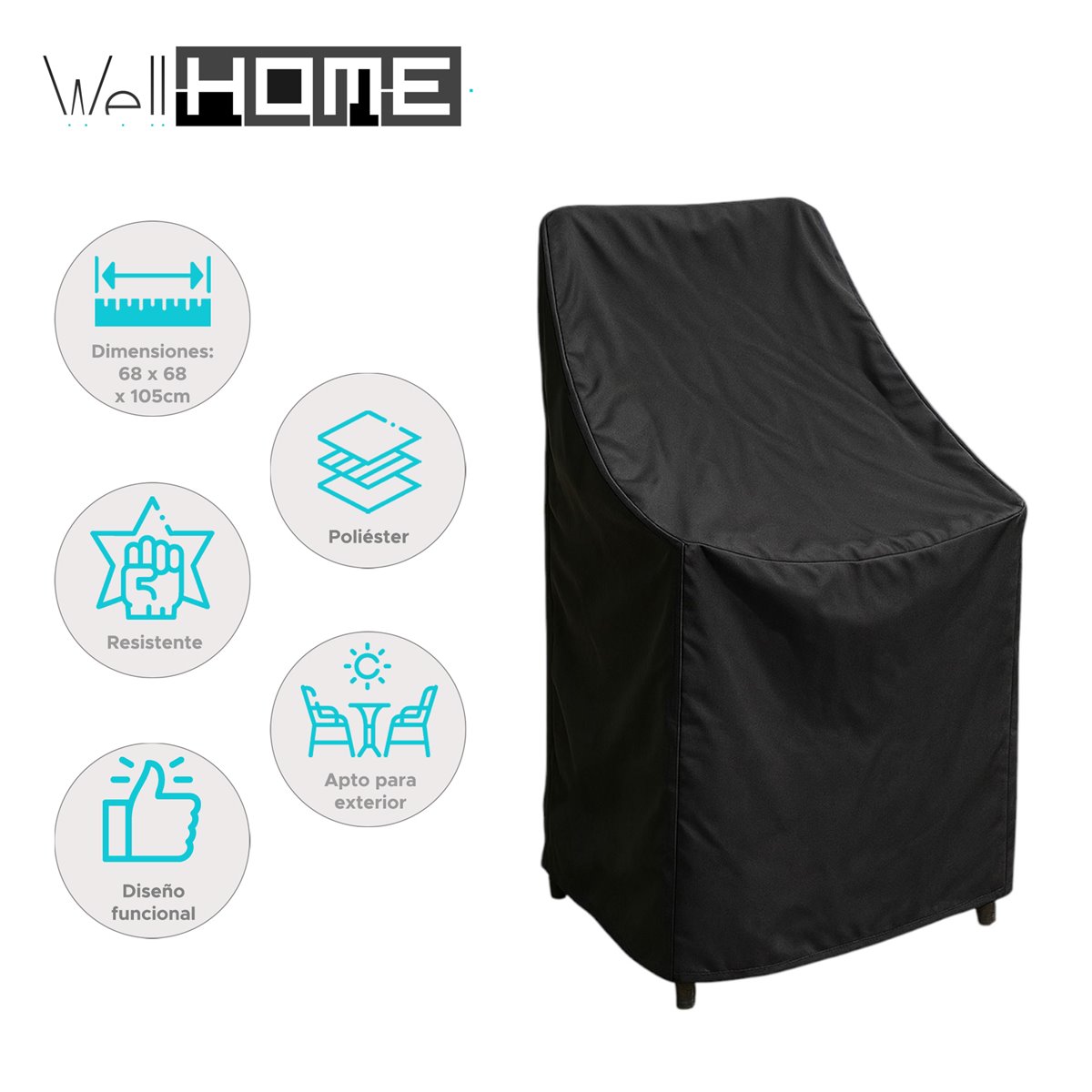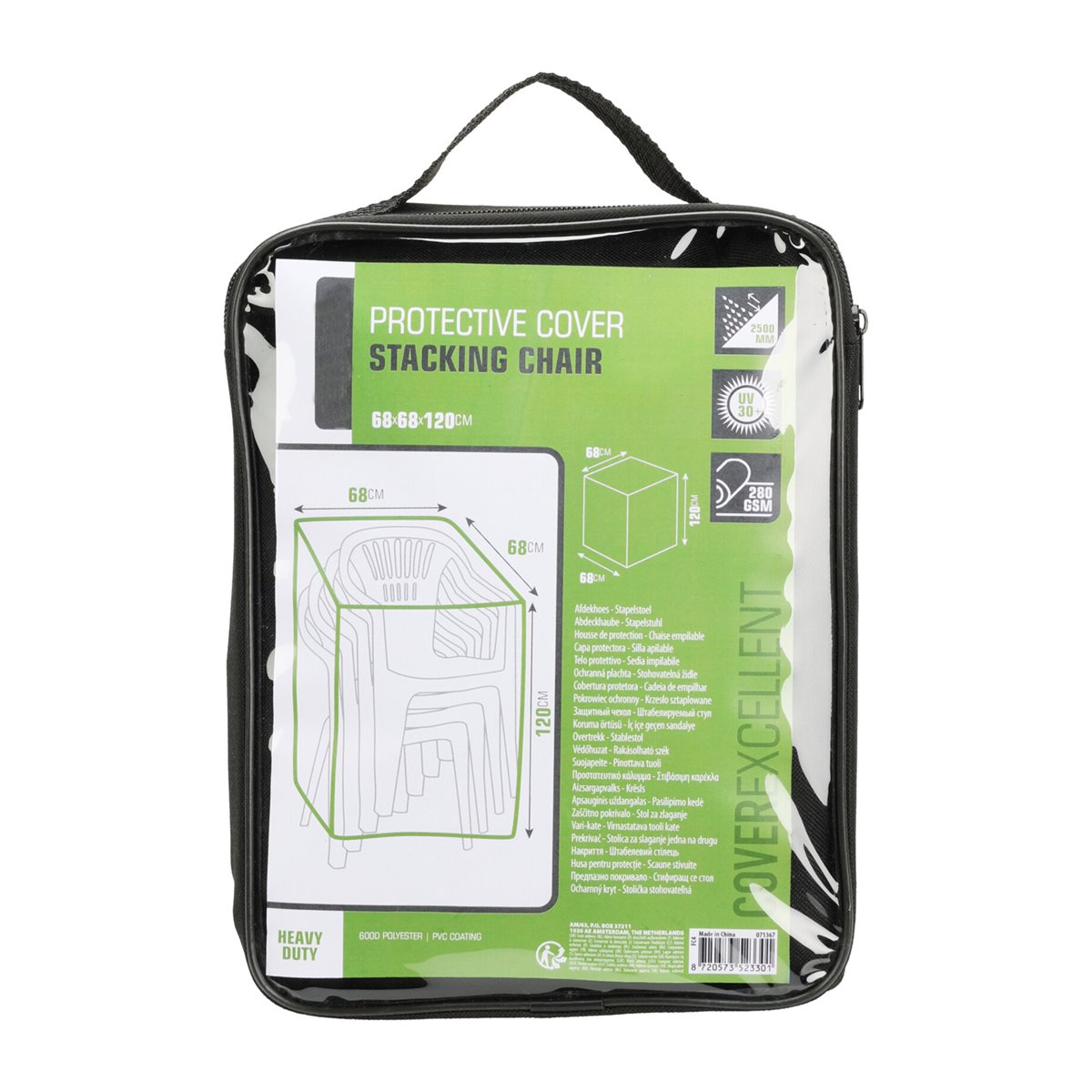 Funda para silla apilable de tamaño 68x68xH120cm, cuadrada y en color negro. Fabricada en poliéster 600D con recubrimiento PV en el interior, con un espesor de 280GSM y resistente al agua hasta 2500mm por m2. Ofrece protección UV de 30+ y viene embalada en una bolsa de transporte de poliéster 600D con cremallera negra y ventana PV, con inserto de color.