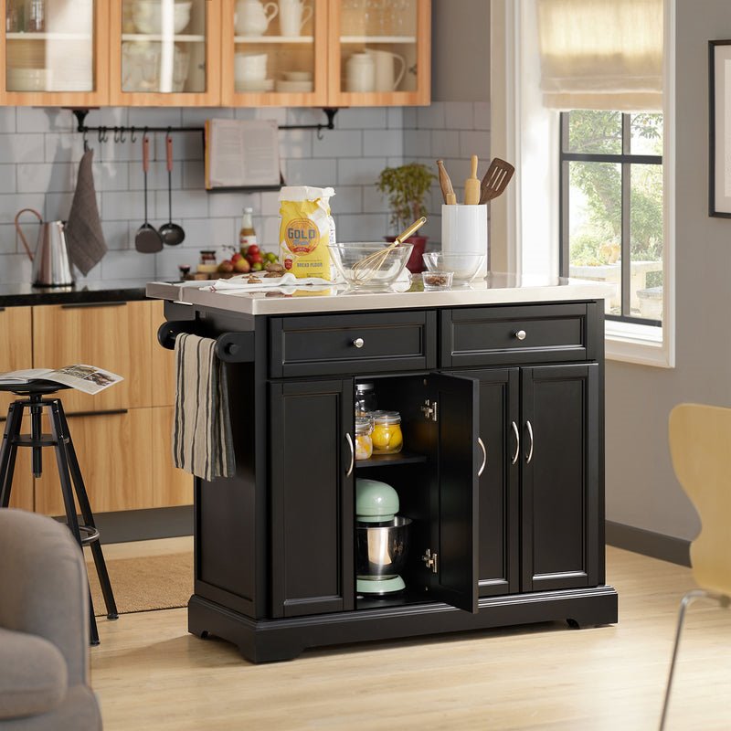 Con gran superficie de trabajo de acero inoxidable, 1 tablero extensible, 2 cajones, 4 puertas,1 toallero.