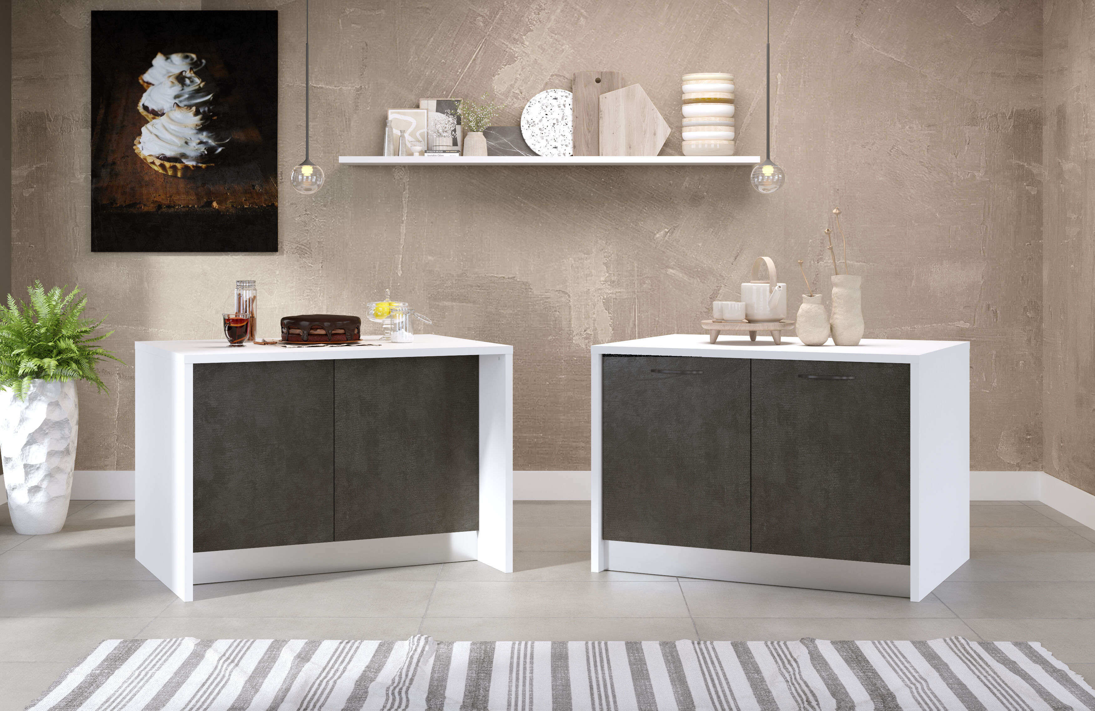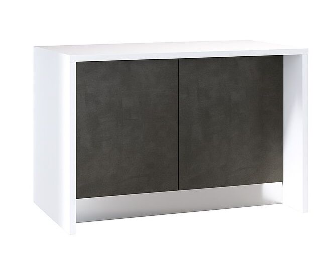 Isla de cocina GILDA 2.0 L120 cm. Blanco/Gris oscuro. Isla con almacenaje, fabricada con panel de partículas. Consta de dos bases de 60 cm, 1 puerta en cada base, puertas de cierre suave y balda interior en cada base. Dimensiones totales L126,2cm H.87cm P.90cm. Con esta isla podrás disfrutar de una cocina de revista a un precio de escándalo. Elige el acabado que mejor se adapate al diseño de tu estancia y disfruta solo o en compañía del buen diseño.