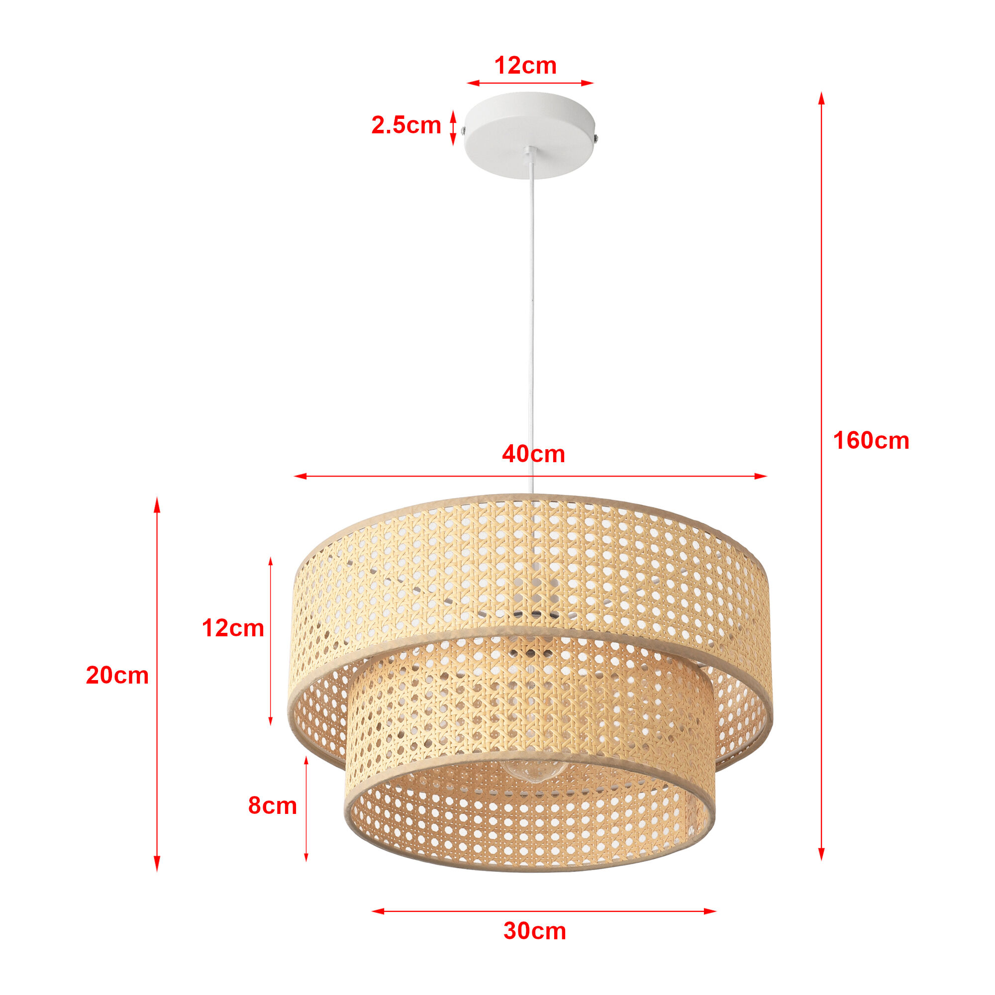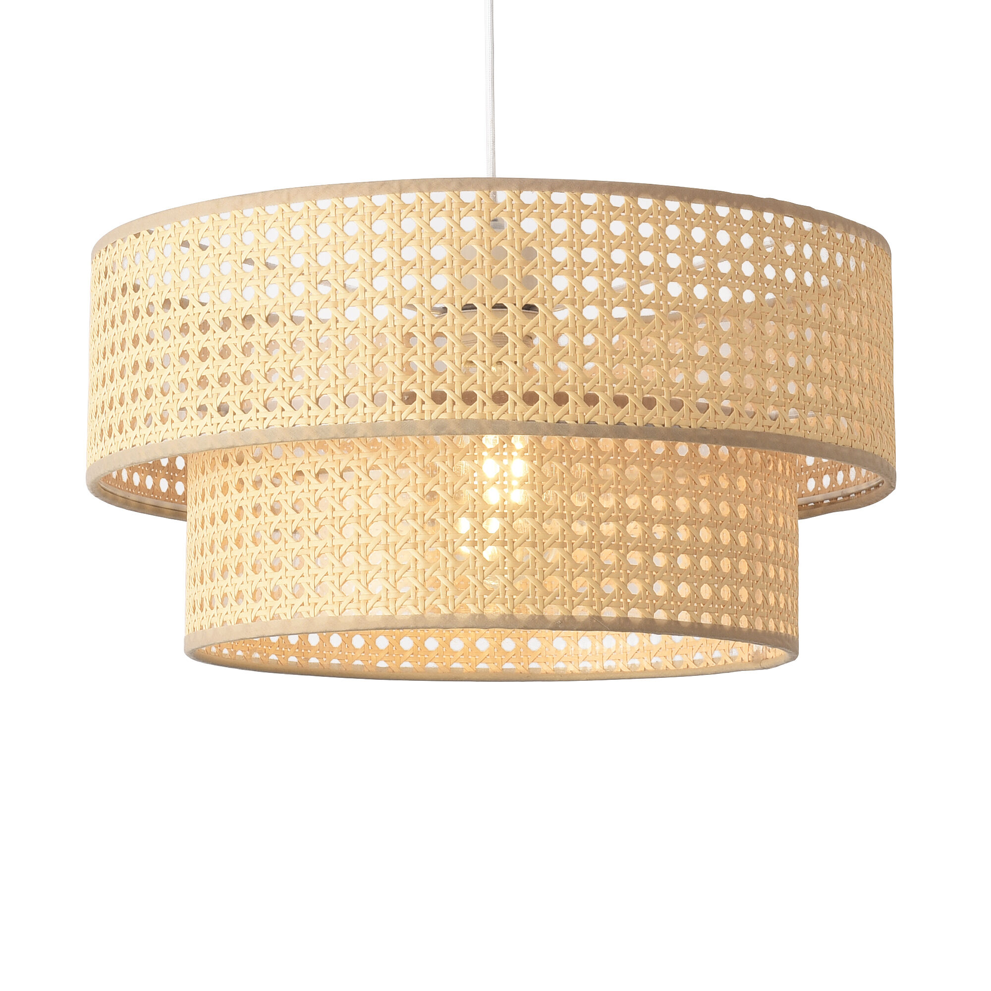 La lámpara colgante destaca por su doble pantalla de ratán, que combina tamaños diferentes para crear un contraste visual encantador. Su luz cálida añade un toque de armonía y confort a cualquier espacio. Ideal para quienes buscan una solución funcional sin renunciar al estilo.