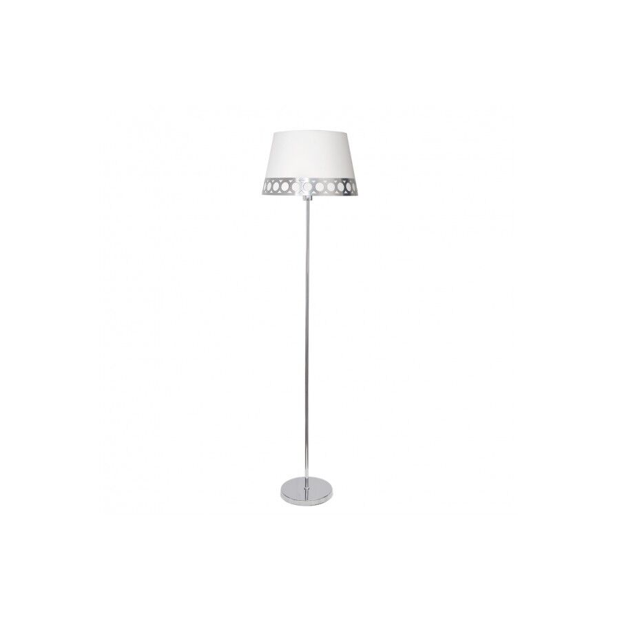 La lampara de pie modelo Dalia de Fabrilamp esta fabricada en metal y pantalla en material textil de color blanco decorada con motivos circulares en plata. Posee un portalámparas de E27.