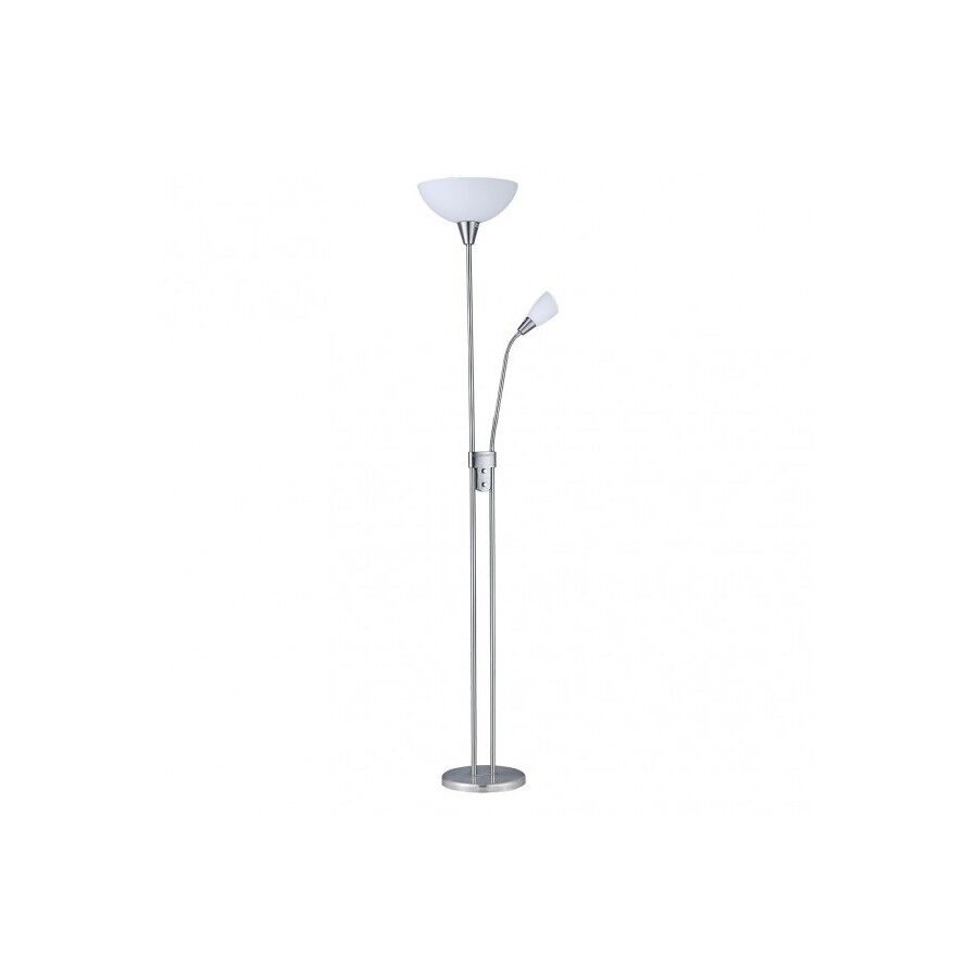 Pie de salón serie Deneb con lector de color niquel satinado, realizado en metal y policarbonato. Presenta dos portalámparas, 1XE27 y 1XE14, con lector orientable que permite direccionar el punto de luz donde desee. Bombillas no incluidas.
