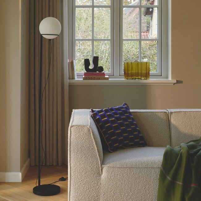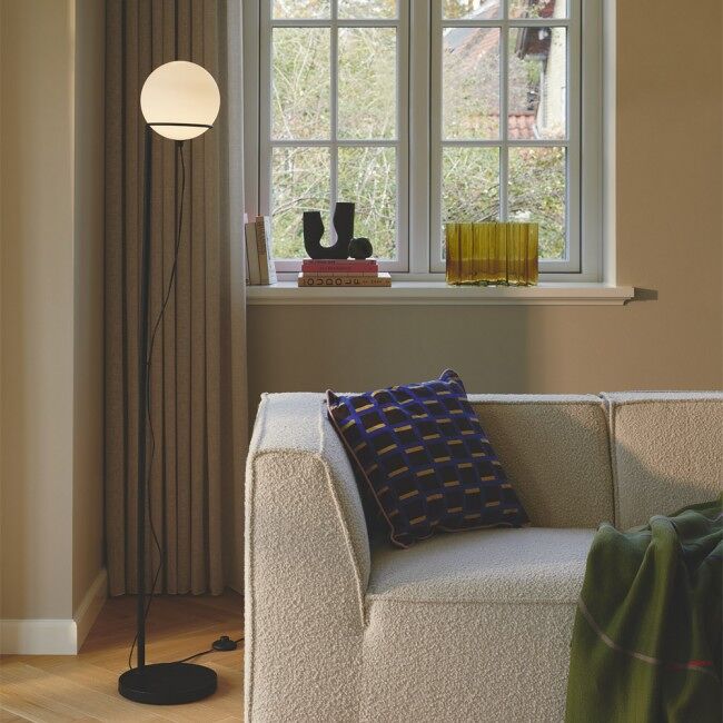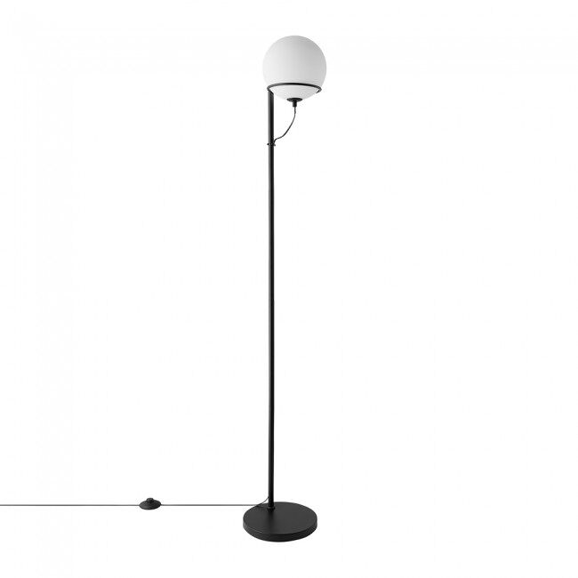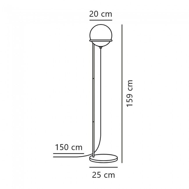 Características Alto: 159 Cm. Diámetro: 25 Cm. Acabado estructura: Negro Acabado tulipa: Opal Material: Metal y Cristal