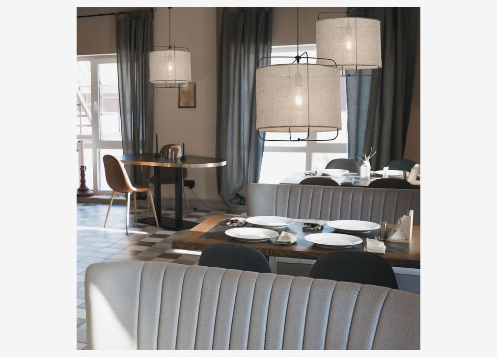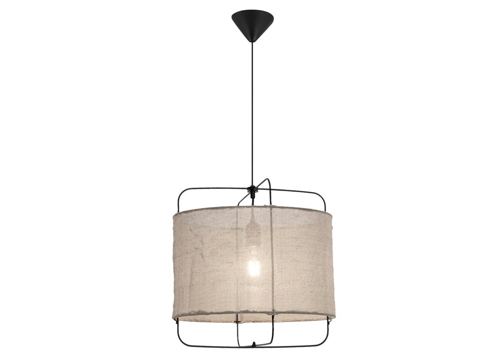 Lámpara de techo WILSON. Una original y elegante propuesta que además de iluminar forma parte de la decoración del hogar, dotándola de sofisticación. Una lámpara con un estilo actual y moderno, que quedará perfecta en salones y/o dormitorios entre otras ubicaciones dentro y fuera del hogar. Estructura fabricada en metal de color negro y pantalla de tela. Usa bombilla E27, compatibles con tecnología Led (no incluida), potencia máxima 40w, tamaño 42X42X50cm.