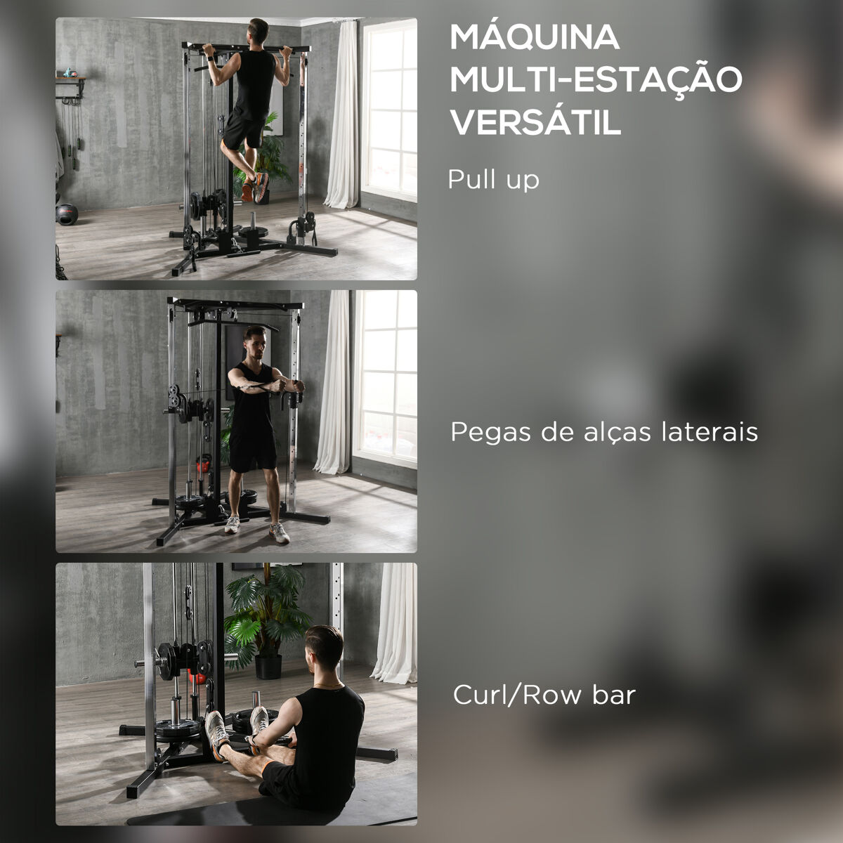 - Cuenta con una polea alta, una polea baja y una estación de dominadas con múltiples agarres