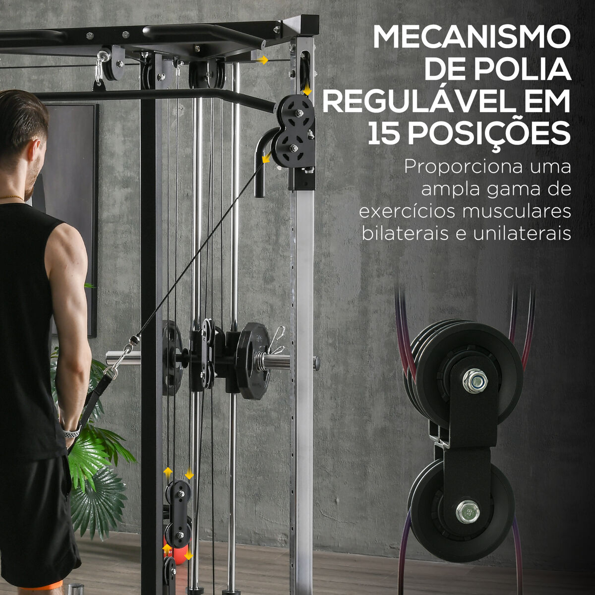 - Sistema de poleas dobles de 15 posiciones ajustables para una amplia gama de ejercicios musculares bilaterales y unilaterales