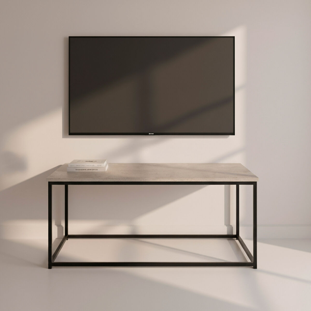 - Resistente y duradera: su tablero de MDF efecto cemento y estructura metálica negra (90x48x40 cm) la convierten en una mesa de centro robusta a la vez que decorativa