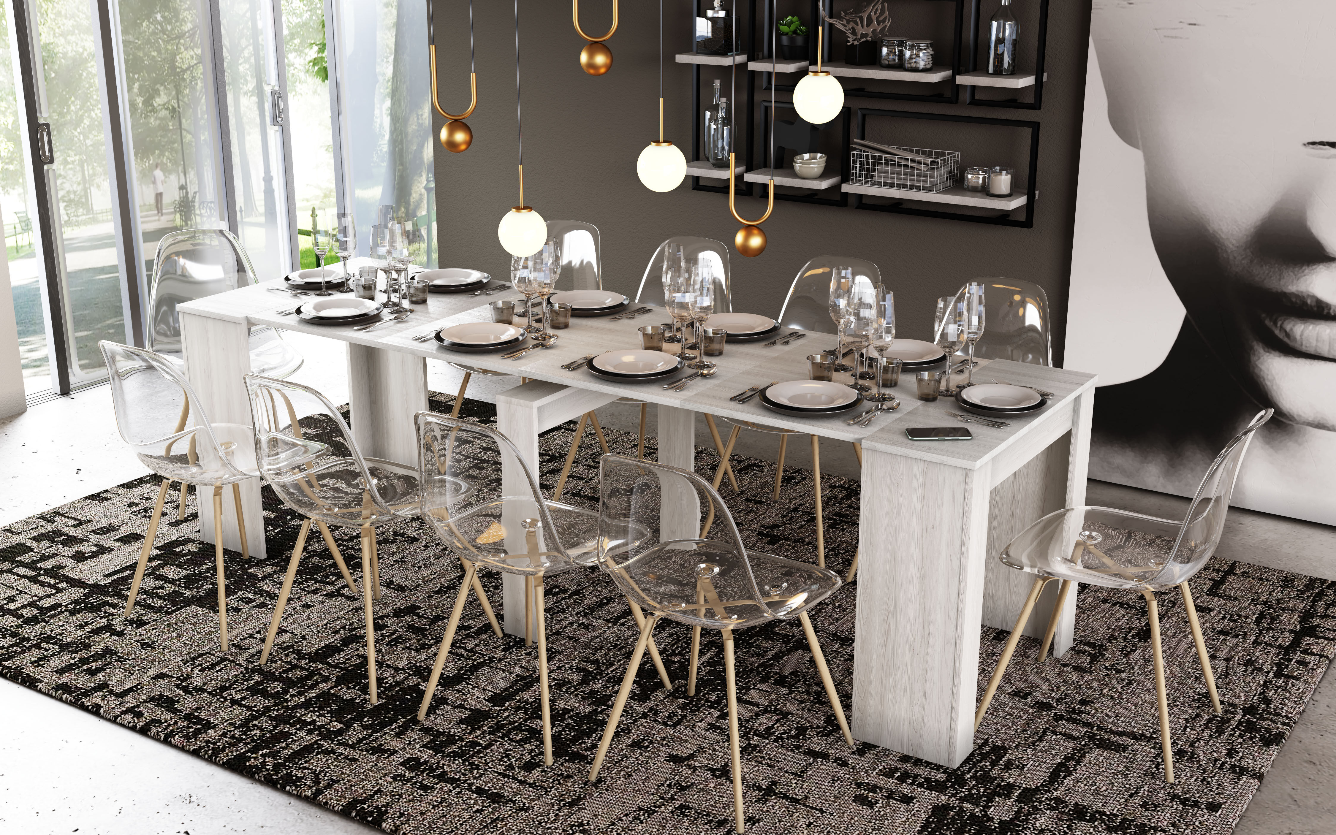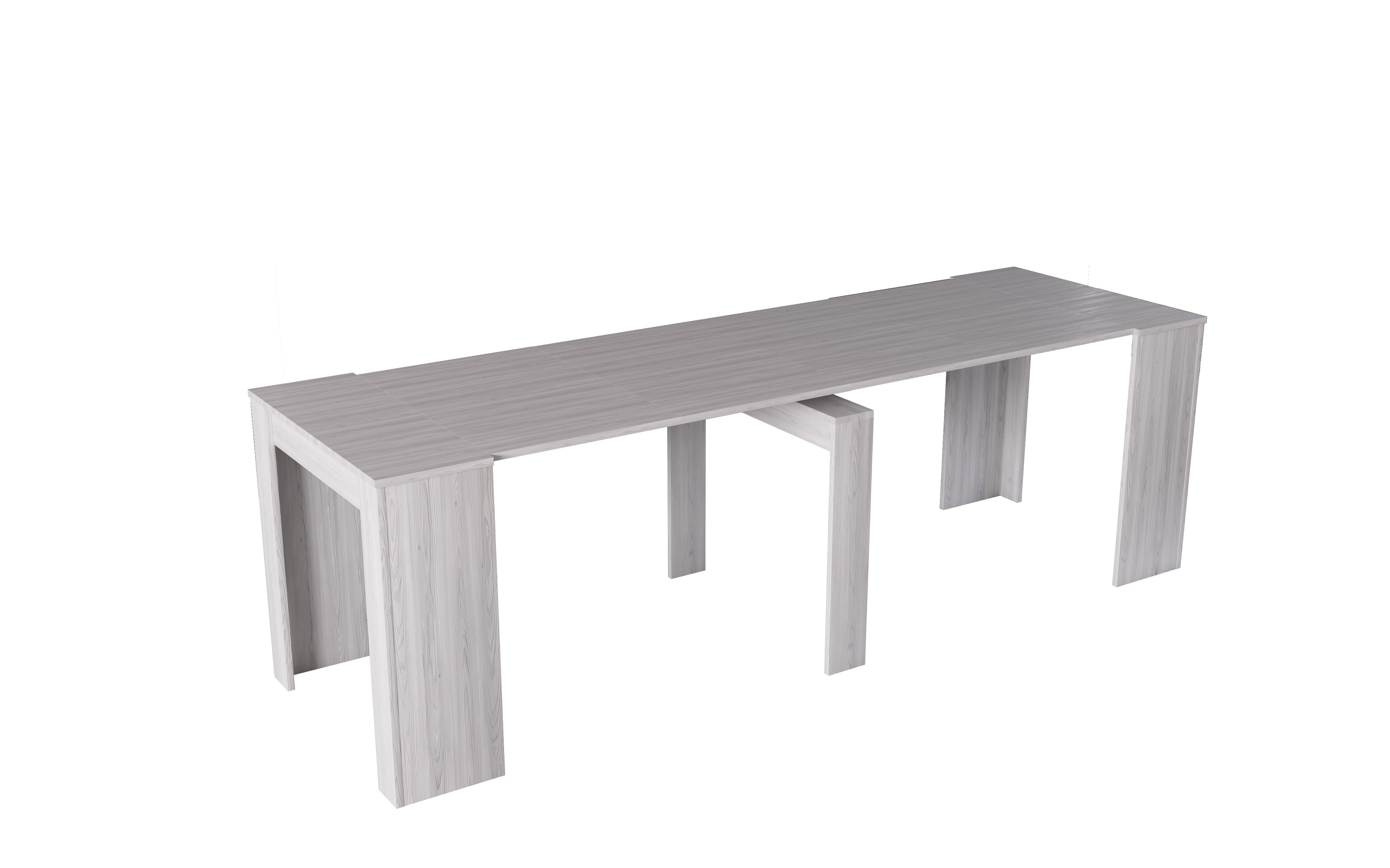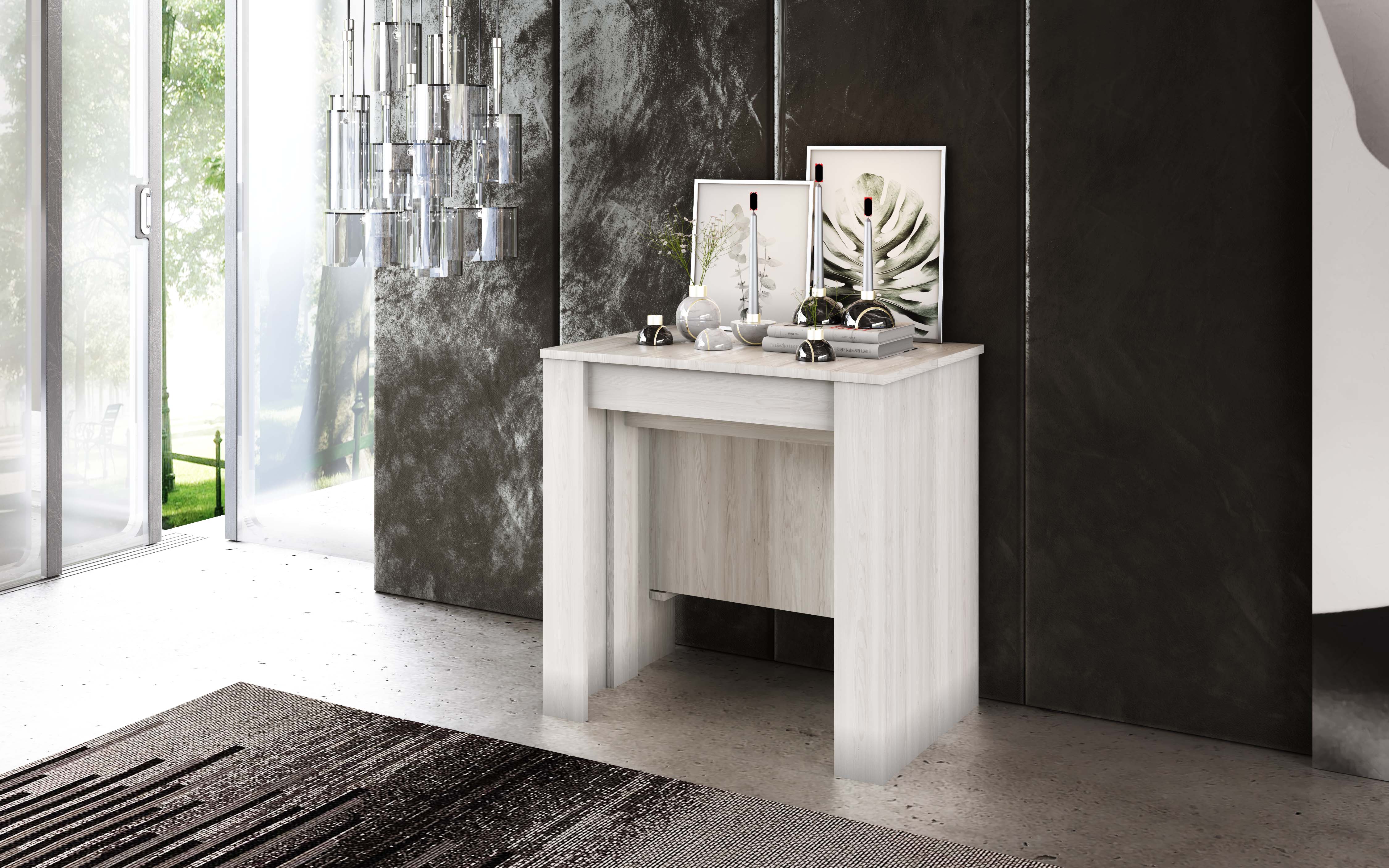 Convierte coqueta mesa consola BERTA en una amplísima mesa de comedor, incorporándole fácilmente la extensión que incluye. Esta mesa extensible pasará de tener sus 54 cm iniciales a ofrecerte, para tu sorpresa, una superfície de 252 cm. Fabricada en panel de partículas y con un bonito color blanco jaspeado, ya no tienes excusa para no rodearte de los tuyos y celebrar grandes banquetes y fiestas en casa. Con esta mesa extensible nadie se quedará sin un sitio en el que sentarse y disfrutar de una inolvidable velada. Y cuando quieras recuperar espacio para tu comedor, retira su extensión sin ningún tipo de problema.