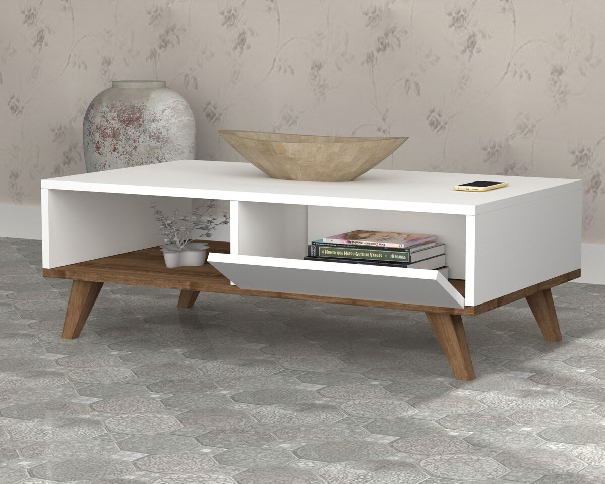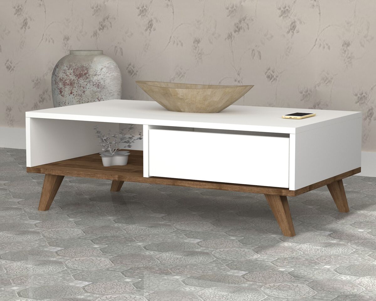 Glin Mesa De Centro. Estructura Melamina. Color Blanco. Grosor 18 Mm. Patas Pvc 12 Cm. Color Nogal. Medidas: 120Anx40Alx56Fon Cm.