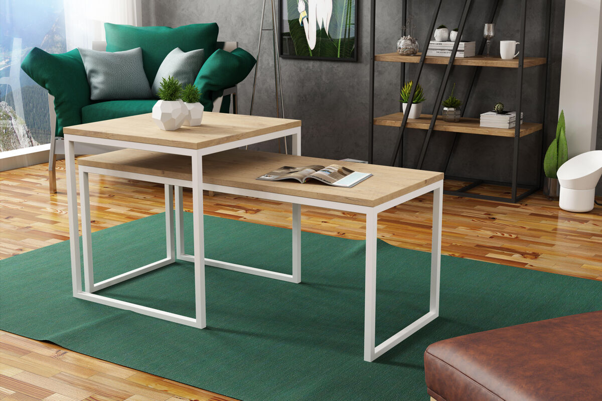 Descubra las mesas de centro TONY, una pareja perfecta para espacios de vida modernos. Este juego incluye una mesa más grande de 50x50x50 cm y una más pequeña, ambas fabricadas con madera de alta calidad con un elegante acabado en melamina y MDF. Las fuertes patas de acero garantizan estabilidad y añaden un toque industrial. La paleta de colores roble y blanco ofrece un aspecto contemporáneo que encaja perfectamente en cualquier decoración. Ya sea que se coloquen juntas o se usen individualmente, las mesas de centro TONY brindan un complemento elegante y práctico para su hogar.