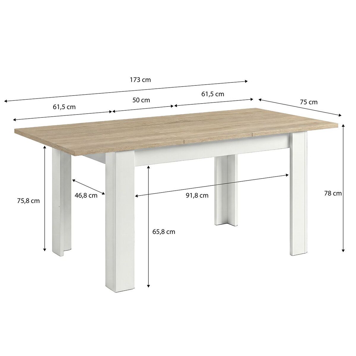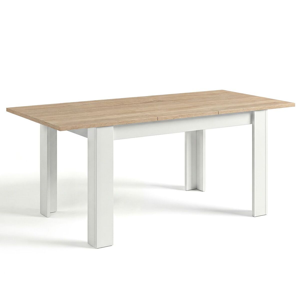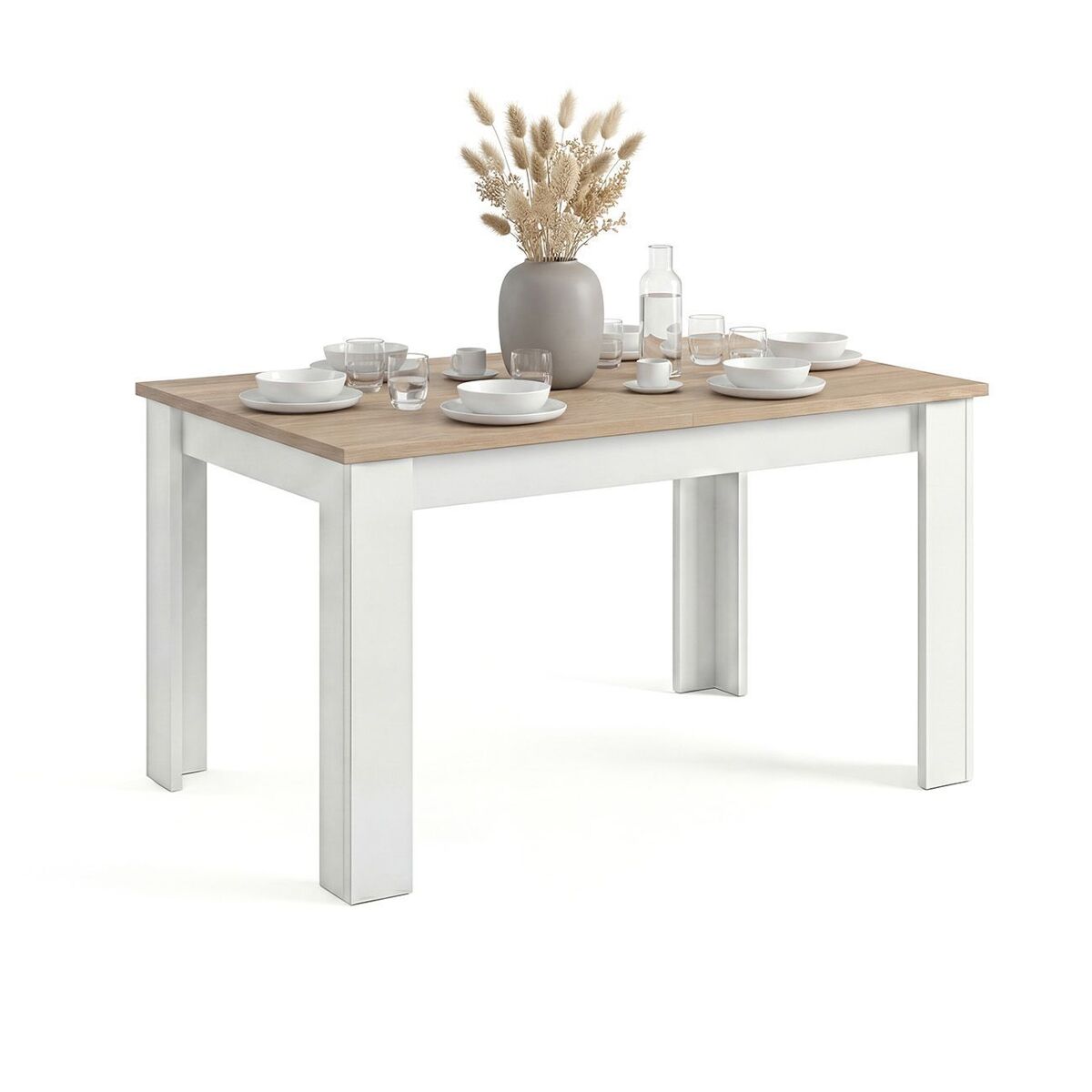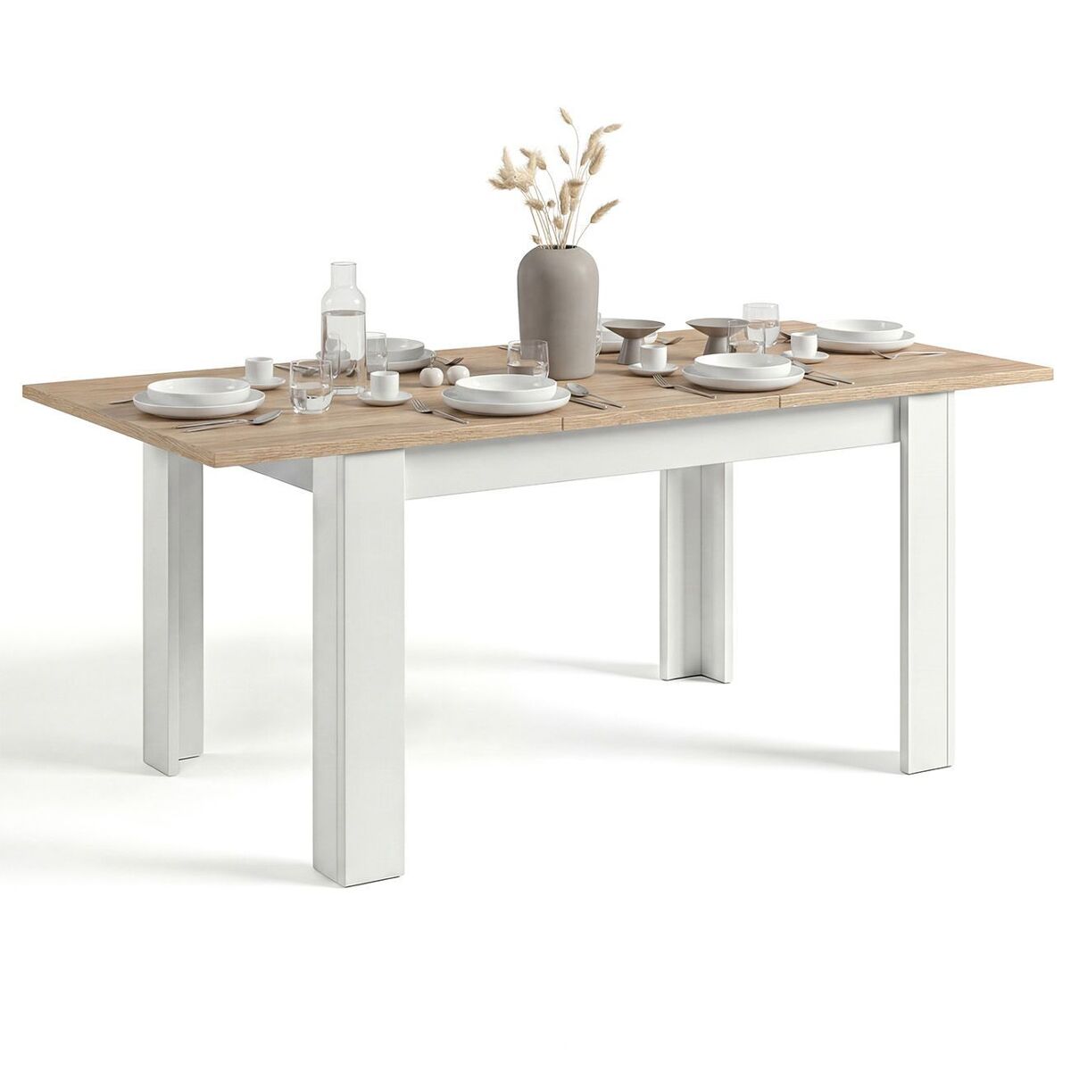 La mesa Sira cuenta con un mecanismo extensible de apertura central, lo que permite ampliar su tamaño en segundos para acomodar hasta 6 comensales sin perder estabilidad. Su sistema de guías metálicas garantiza un deslizamiento suave y seguro, ideal para reuniones familiares, cenas con amigos o simplemente para disponer de más espacio cuando lo necesites.