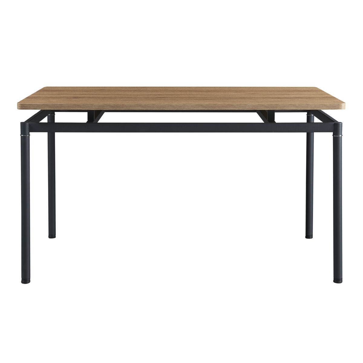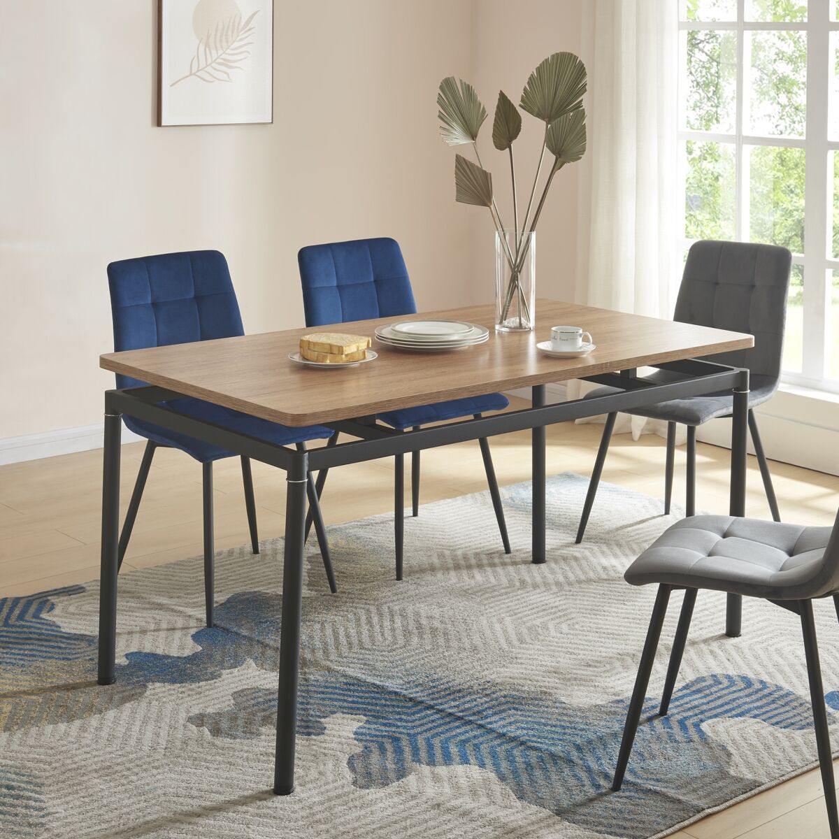 La combinación del tablero de MDF efecto roble y las patas de acero negro le dan un toque moderno y sofisticado, a la vez que aportan una elegancia distintiva al conjunto del mueble. La apariencia del tablero de la mesa flotando por encima del marco añade una sensación de ligereza y modernidad al diseño general, mientras que las 4 robustas patas garantizan la estabilidad y seguridad de la mesa.