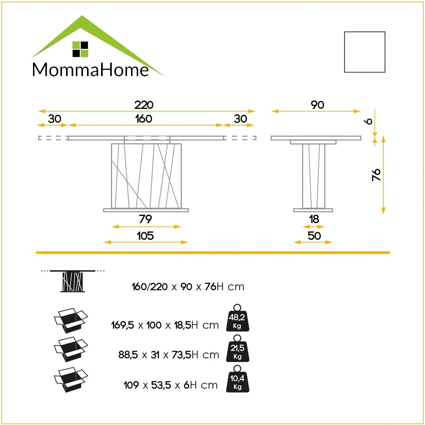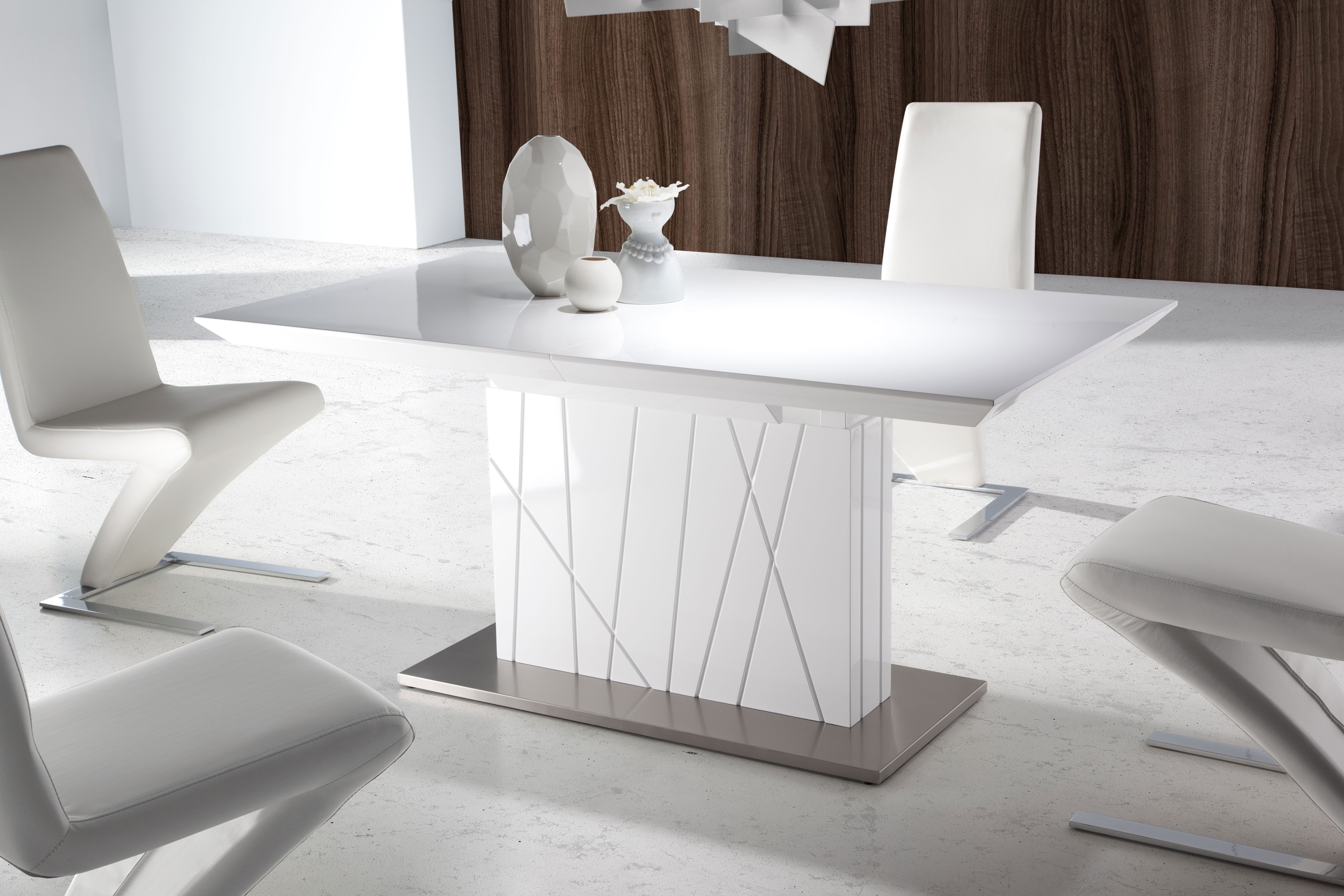 Mesa de Comedor Rectangular Extensible AMBRA con sistema de extensión central de apertura tipo libro. Esta imponente y robusta mesa tiene una encimera y un único pie central realizados en madera MDF lacada en color blanco alto brillo. Para conferir mayor estabilidad al conjunto y aportarle un innegable toque de elegancia y distinción, está rematada con una base acero inoxidable mate. La peana central lleva un dibujo de hendiduras decorativas irregulares. Para extender la mesa basta con deslizar uno de sus extremos, desplegar el extensible de 60 cm y encajarlo con los extremos. Ideal para combinar con el aparador y mueble de TV a juego. Mueble premontado. Uso exclusivo de interior. Medidas: 160/220 x 90 x 76H cm.