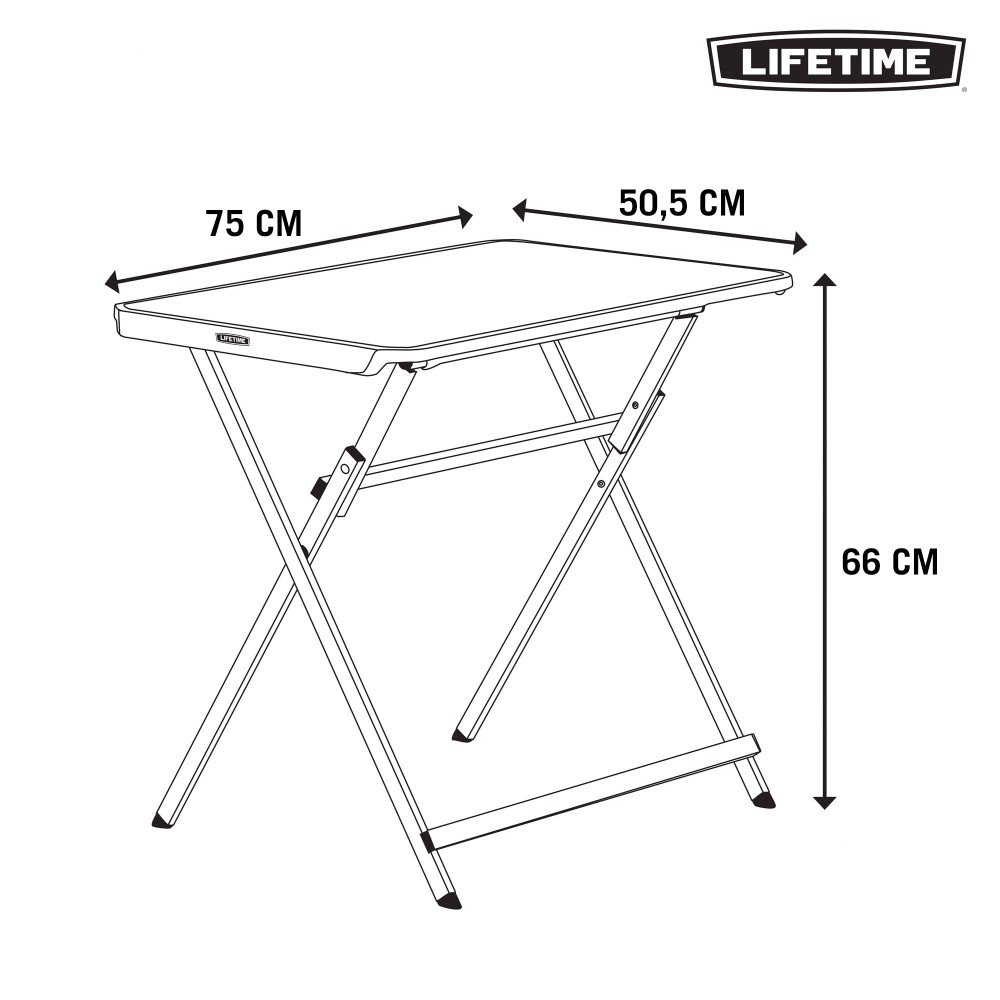 Mesa plegable negra de uso individual Lifetime. Tablero de polietileno de alta densidad con protección UV y estructura robusta de acero con revestimiento en polvo antióxido. Medidas tablero: 75 x 50,5 cm, altura: 66 cm. Sus patas y tablero se pliegan verticalmente y cuenta con asa de transporte para moverla fácilmente y almacenarla sin apenas ocupar espacio. Duradera, resistente y ligera. Perfecta para uso personal.