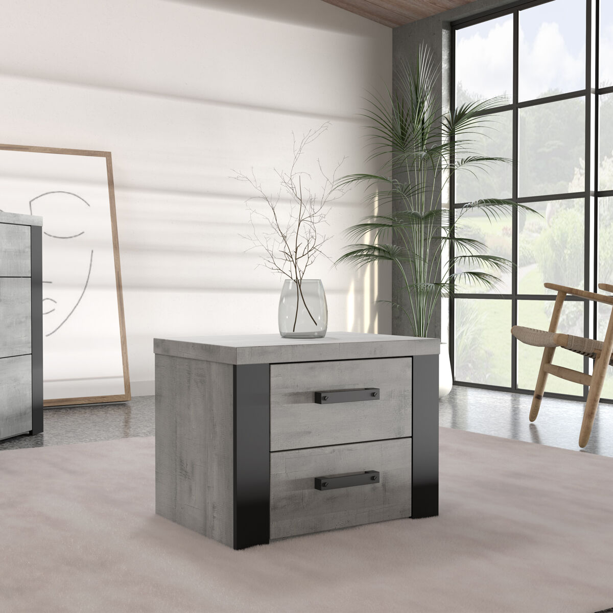 ¡Disfruta de un hermoso diseño minimalista y de una práctica solución de almacenamiento para tu dormitorio con la mesita de noche NELEKE! Esta mesita de noche de 3 cajones está hecha de tableros de partículas y tiene un acabado en color Cemento loftwood/Negro mate, lo que le da un aspecto elegante pero moderno. Perfecto para la decoración de cualquier dormitorio, este mueble de alta calidad garantiza que su dormitorio se mantenga organizado y ordenado.