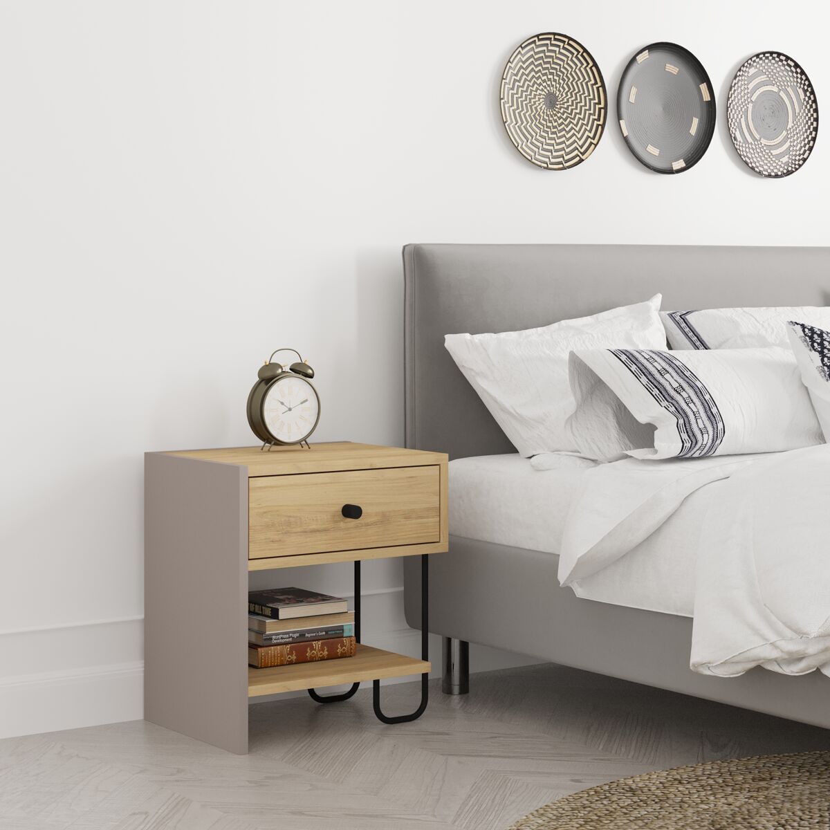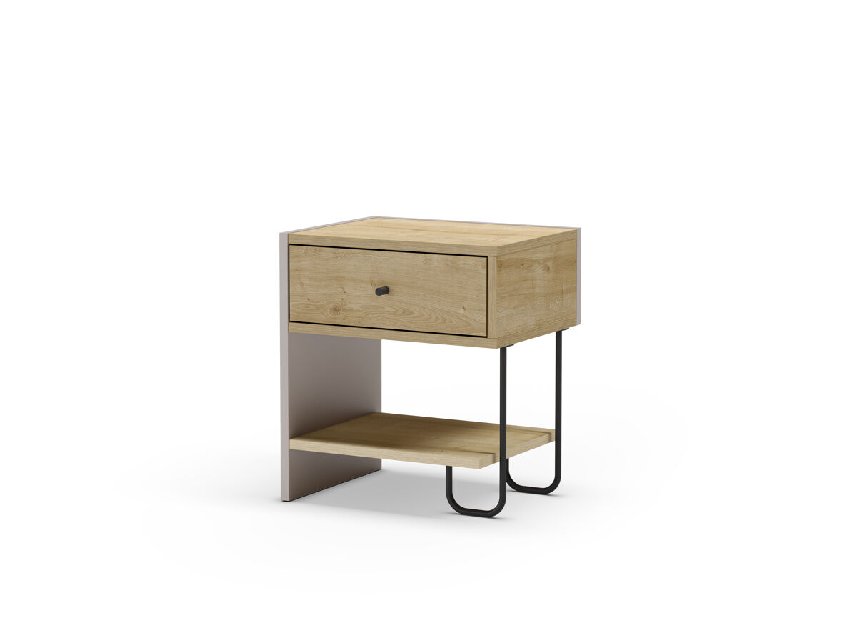 Esta mesita combina la calidez de la melamina en tono madera con la fuerza visual de los detalles metálicos en negro, logrando una estética moderna de inspiración industrial. Su diseño compacto y equilibrado incluye un cajón superior de gran funcionalidad y una repisa inferior ideal para libros, objetos decorativos o elementos de uso diario. Las patas metálicas en forma tubular aportan ligereza y estabilidad, mientras que las líneas rectas y los contrastes de materiales refuerzan su carácter contemporáneo. Perfecta como mesita de noche, auxiliar o complemento en espacios reducidos, esta pieza destaca por su versatilidad, durabilidad y su diseño atemporal que se adapta a distintos estilos decorativos.